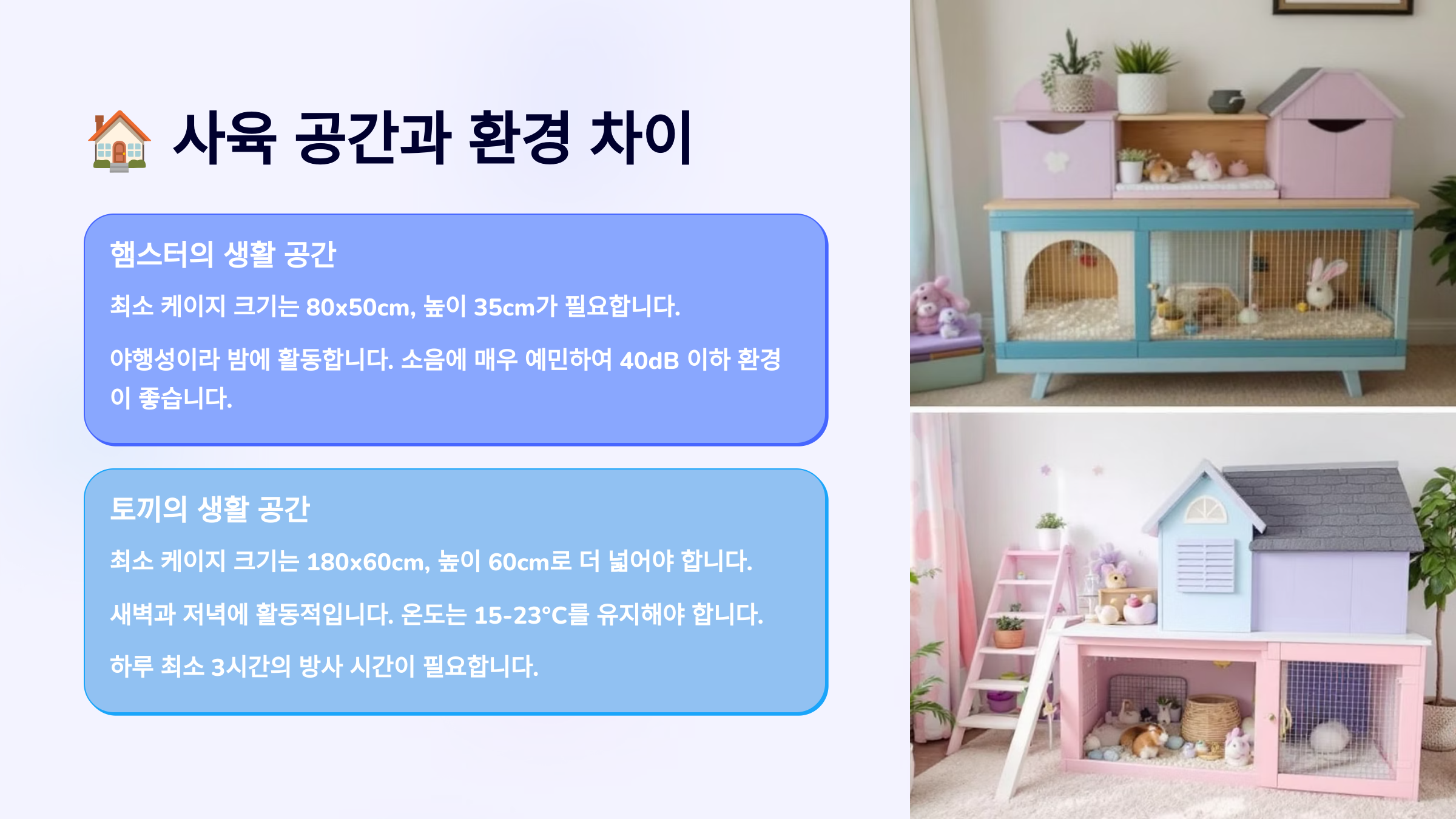 다음은 🏠 사육 공간과 환경 차이입니다. 두 동물의 공간 크기와 설치 장비, 유지 난이도를 비교해드릴게요!