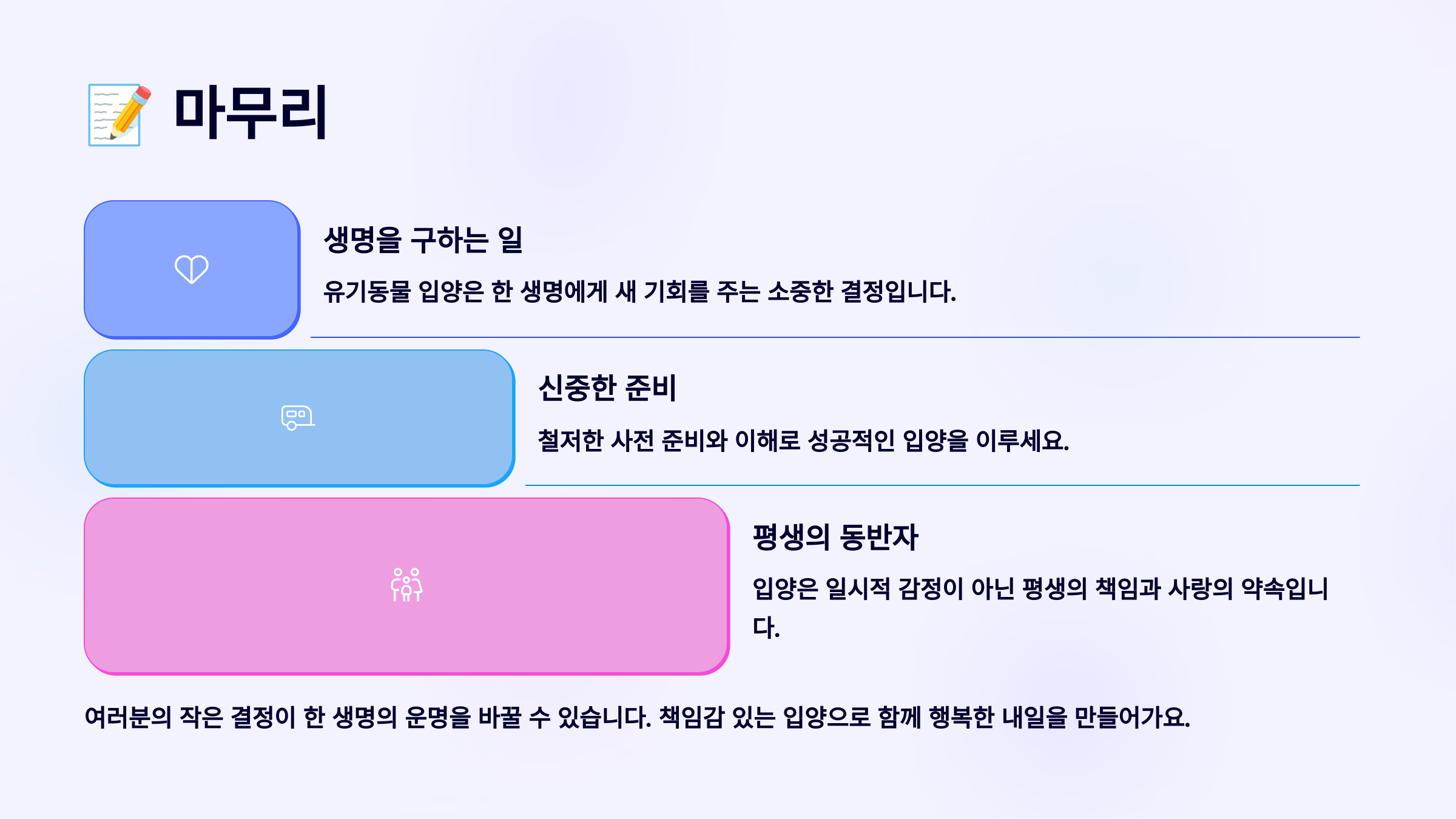 입양은 ‘구입’이 아니라 ‘선택과 약속’이에요. 그 의미를 알고 시작한다면, 더할 나위 없이 멋진 여정이 될 수 있어요 🌈🐾