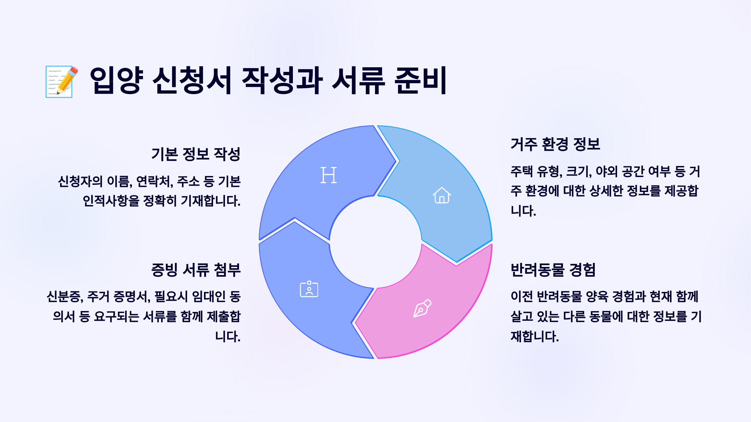 입양 신청서는 단순한 정보 수집지가 아니에요. 보호소는 이 신청서를 통해 입양자의 책임감, 환경, 지속 가능성 등을 꼼꼼히 판단해요. 우리 아이의 ‘두 번째 인생’을 결정짓는 중요한 서류랍니다! 🐶🖋️