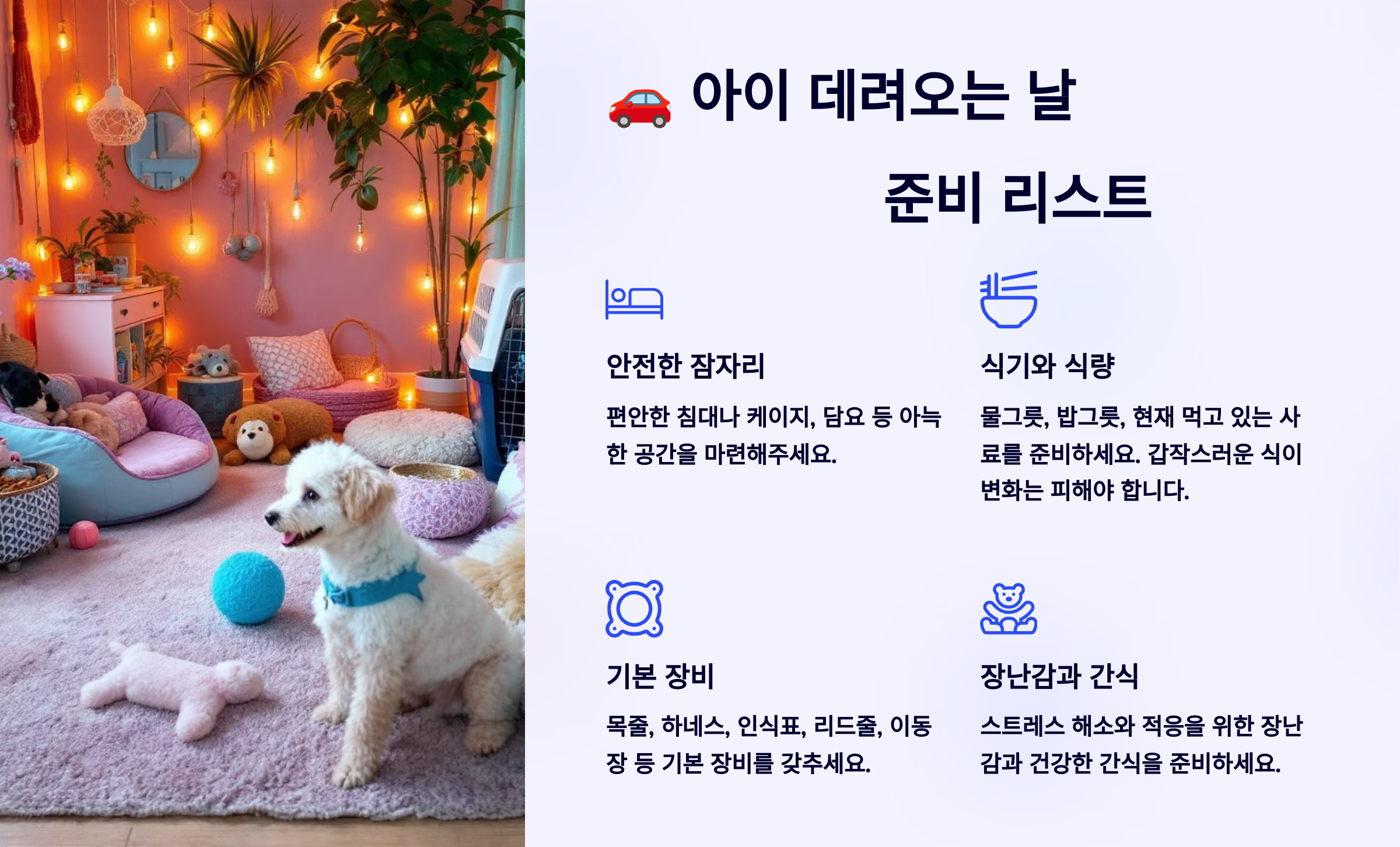 이제 다음은 🚗 아이 데려오는 날 준비 리스트 입양이 확정되고 아이를 데려오는 날, 꼭 챙겨야 할 필수 준비물과 주의사항을 알려드릴게요! 🐶📦🚗