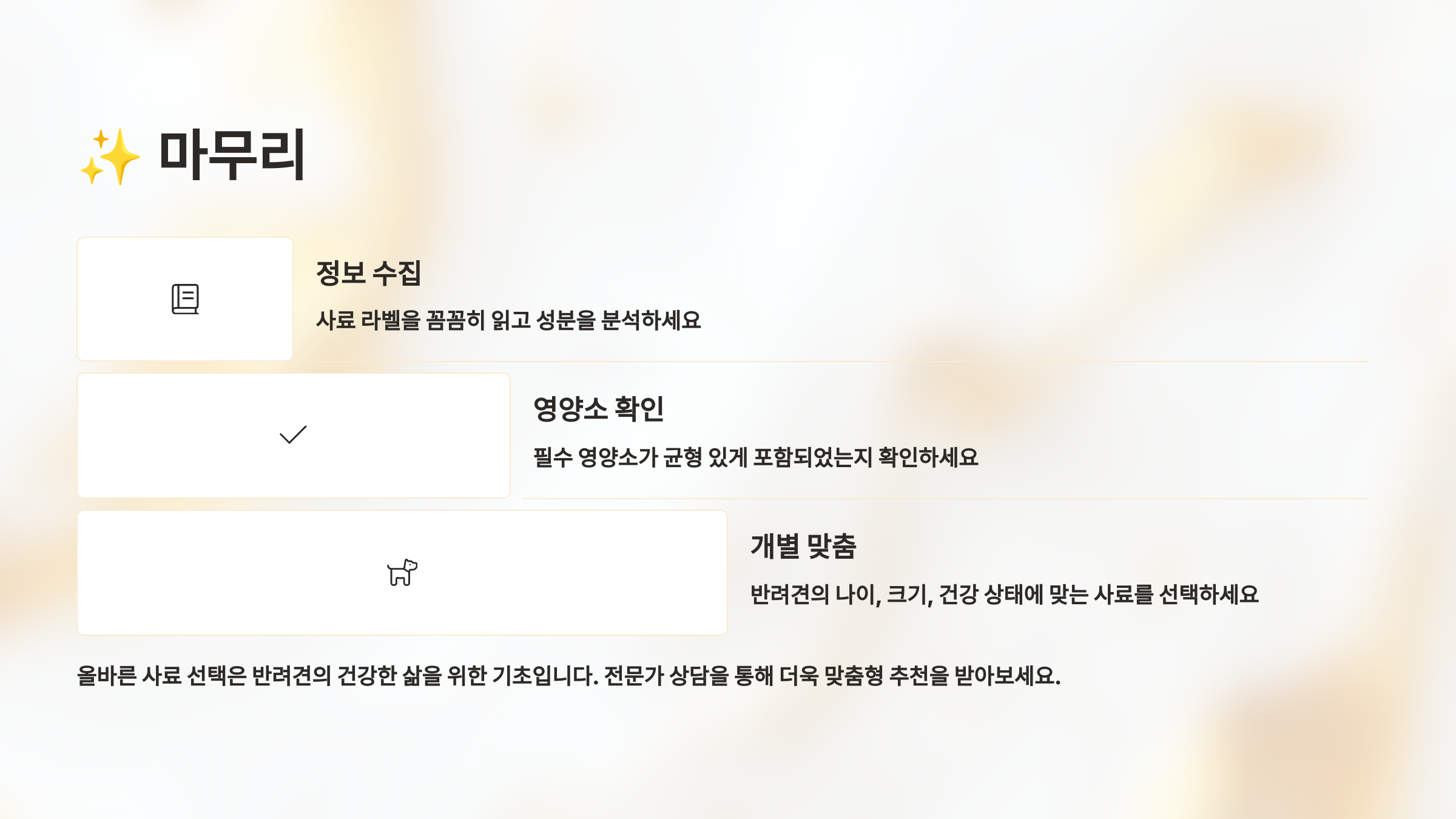 우리 아이에게 가장 편안하고, 맛있게 먹을 수 있으며, 필요한 영양소를 충분히 공급해주는 사료를 찾아주세요. 🐾