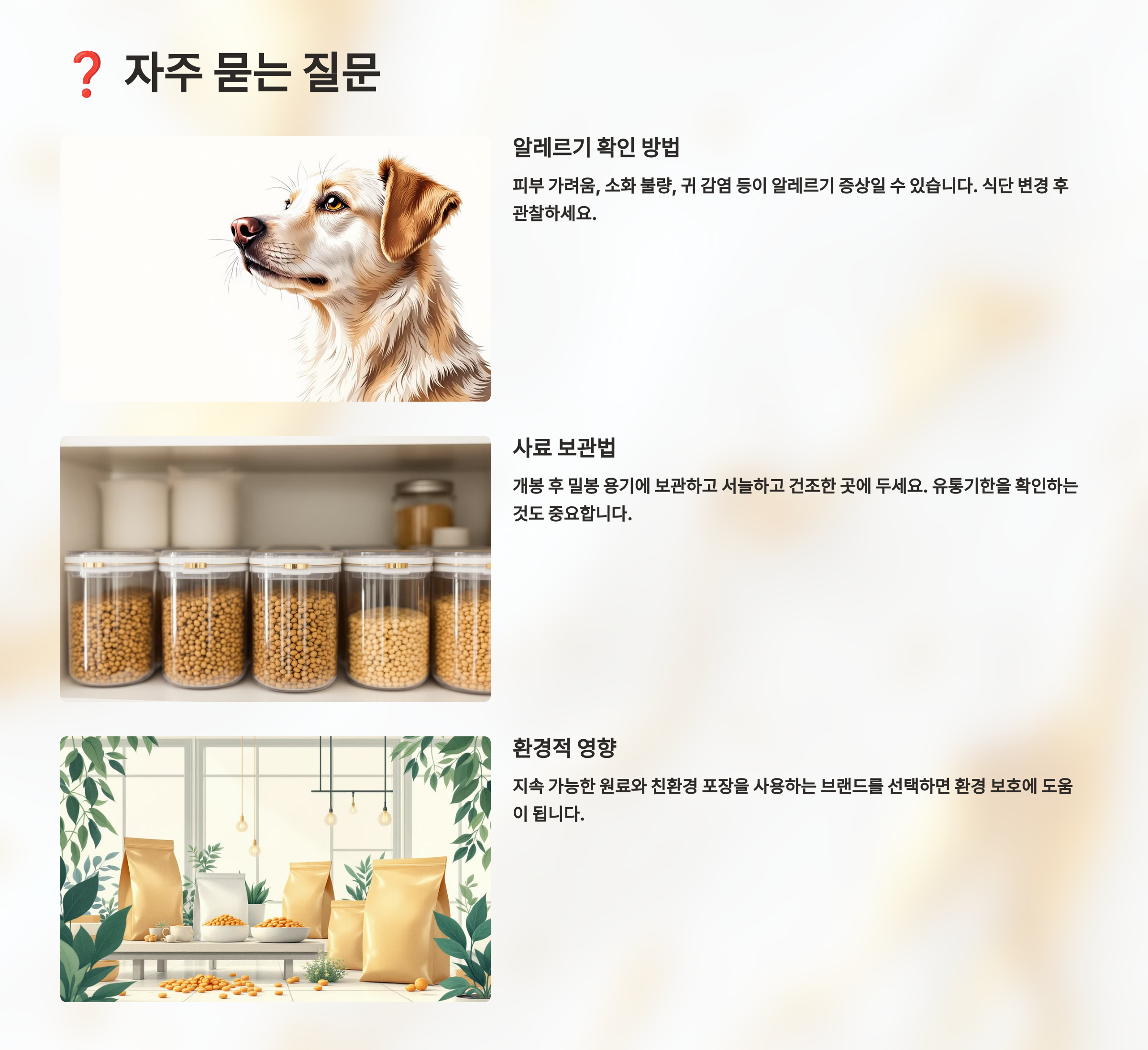 이 글에서 알려드린 사료 선택 기준과 필수/주의 성분들, 그리고 급여 가이드를 바탕으로, 우리 강아지에게 가장 적합하고 맛있는 사료를 찾아주세요. 강아지가 사료를 맛있게 먹고 건강하게 성장하는 모습은 보호자에게 큰 기쁨이 될 것입니다. 💪