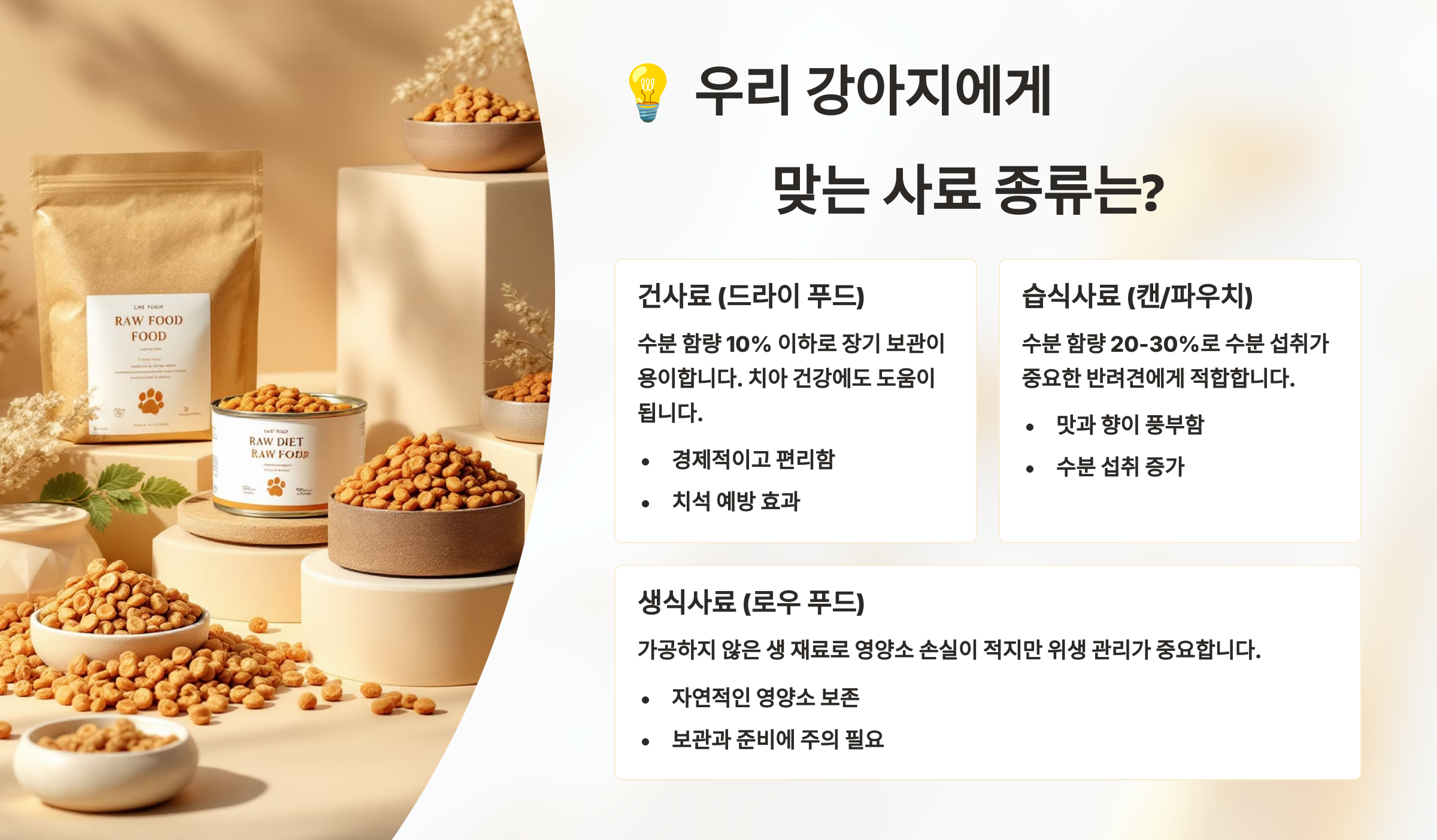 - 💡 우리 강아지에게 맞는 사료 종류는? (건사료, 습식사료, 생식 등)