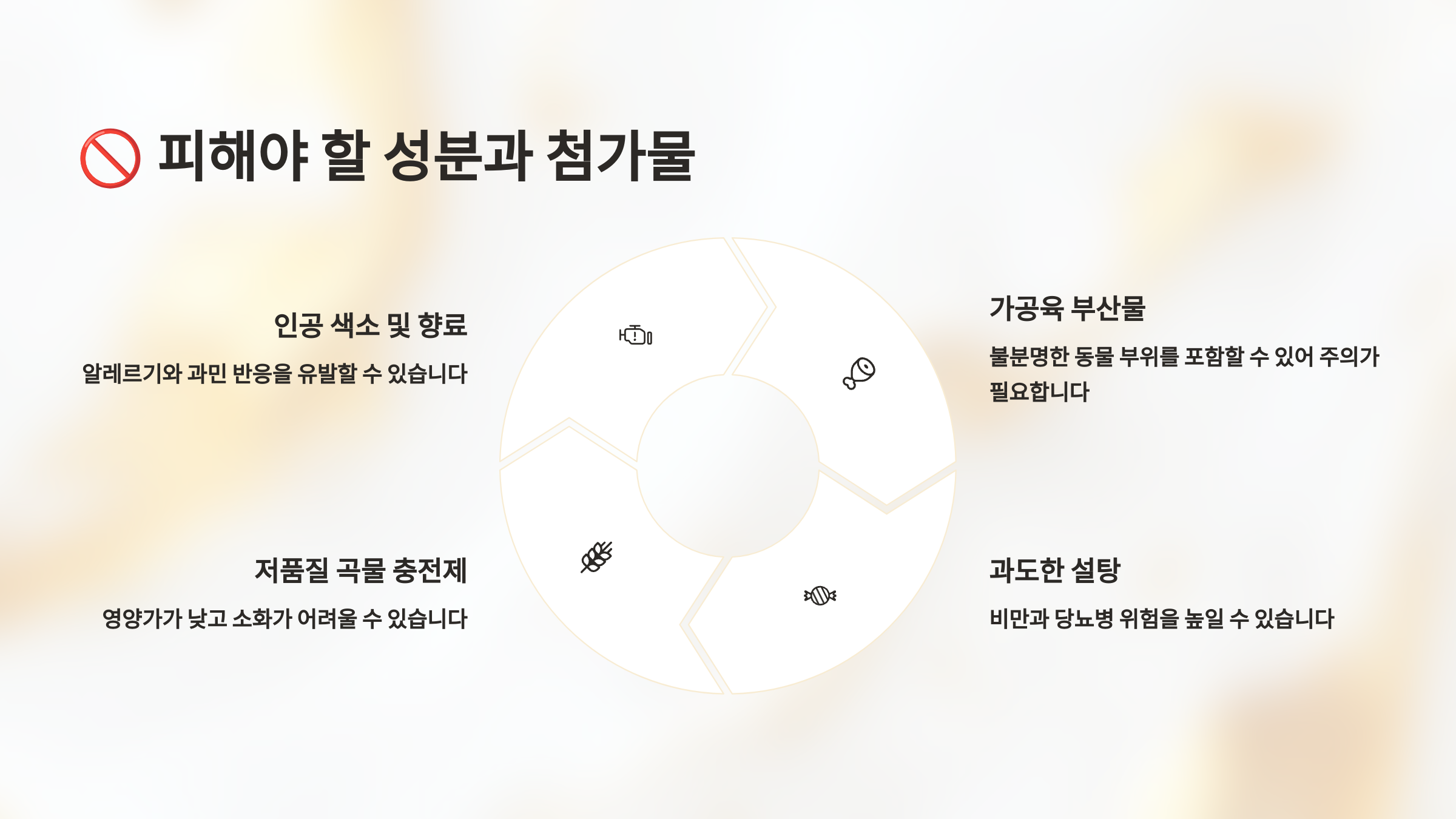- 불분명한 출처의 지방: '동물성 지방(Animal Fat)'처럼 어떤 동물의 지방인지 불분명한 것은 피해야 합니다. '닭고기 지방'처럼 출처가 명확한 것을 선택하세요.