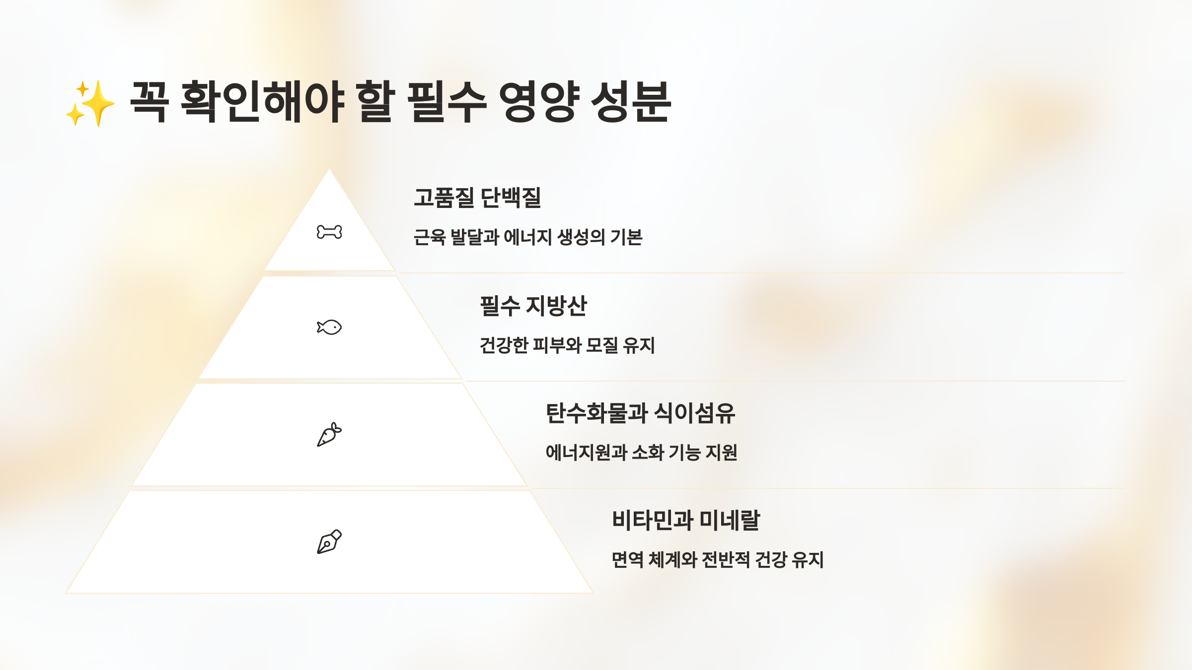 강아지 사료를 선택할 때 어떤 성분들이 우리 아이의 건강에 필수적인지 아는 것은 매우 중요합니다. 단순히 '좋다'고 알려진 성분보다는, 강아지의 신체 기능을 유지하고 성장하는 데 반드시 필요한 영양소들을 중심으로 살펴보아야 합니다.