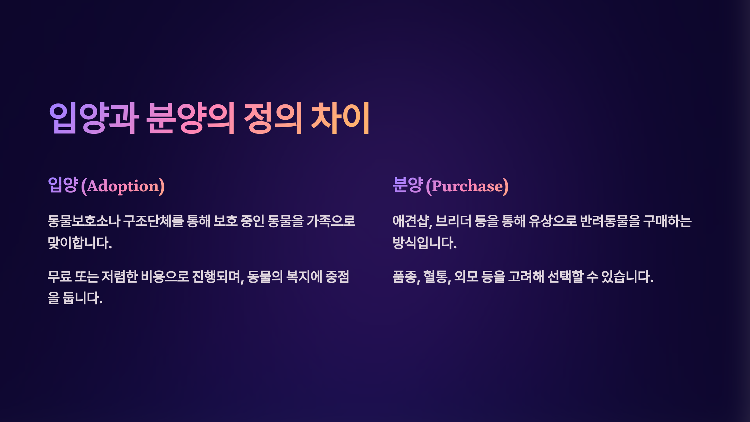 - 📌 입양은 절차가 길고 까다롭지만, 사후관리와 애착 형성에 좋아요.