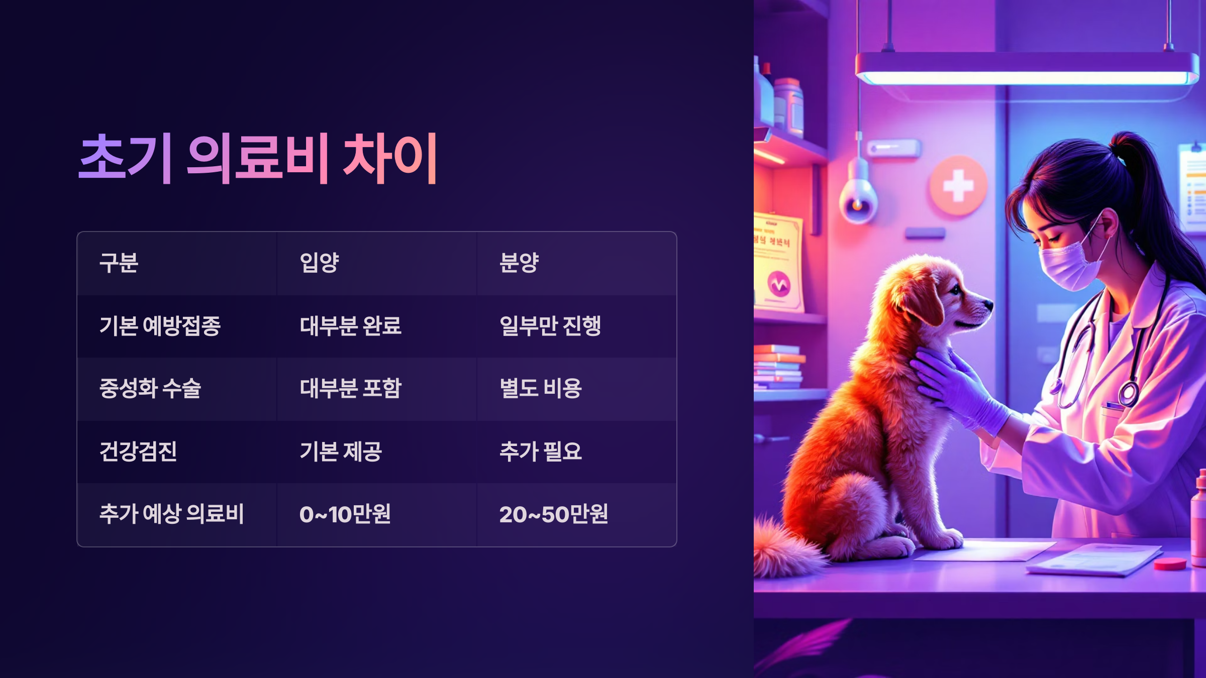 🏥 입양과 분양 모두 반려동물을 데려오면 가장 먼저 동물병원을 방문하게 돼요. 하지만 이때 드는 초기 진료비와 의료 준비 상태는 꽤 다르답니다.