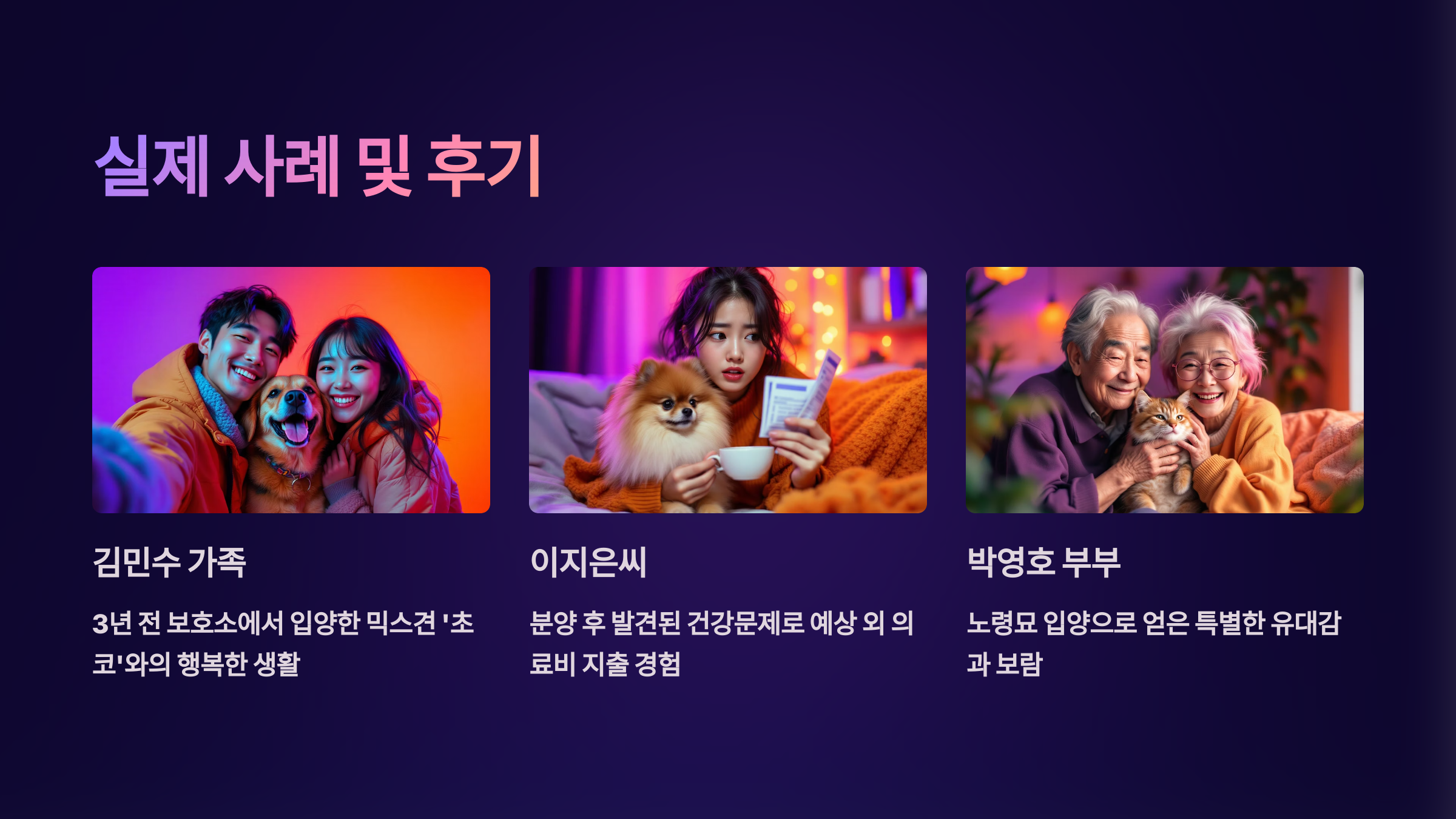 - 👩 “입양했는데 아이가 처음엔 겁도 많고 아팠어요. 하지만 1년 같이 지내니 너무 믿음직한 가족이 됐어요. 의료비 부담은 있었지만 마음만은 뿌듯했죠.”