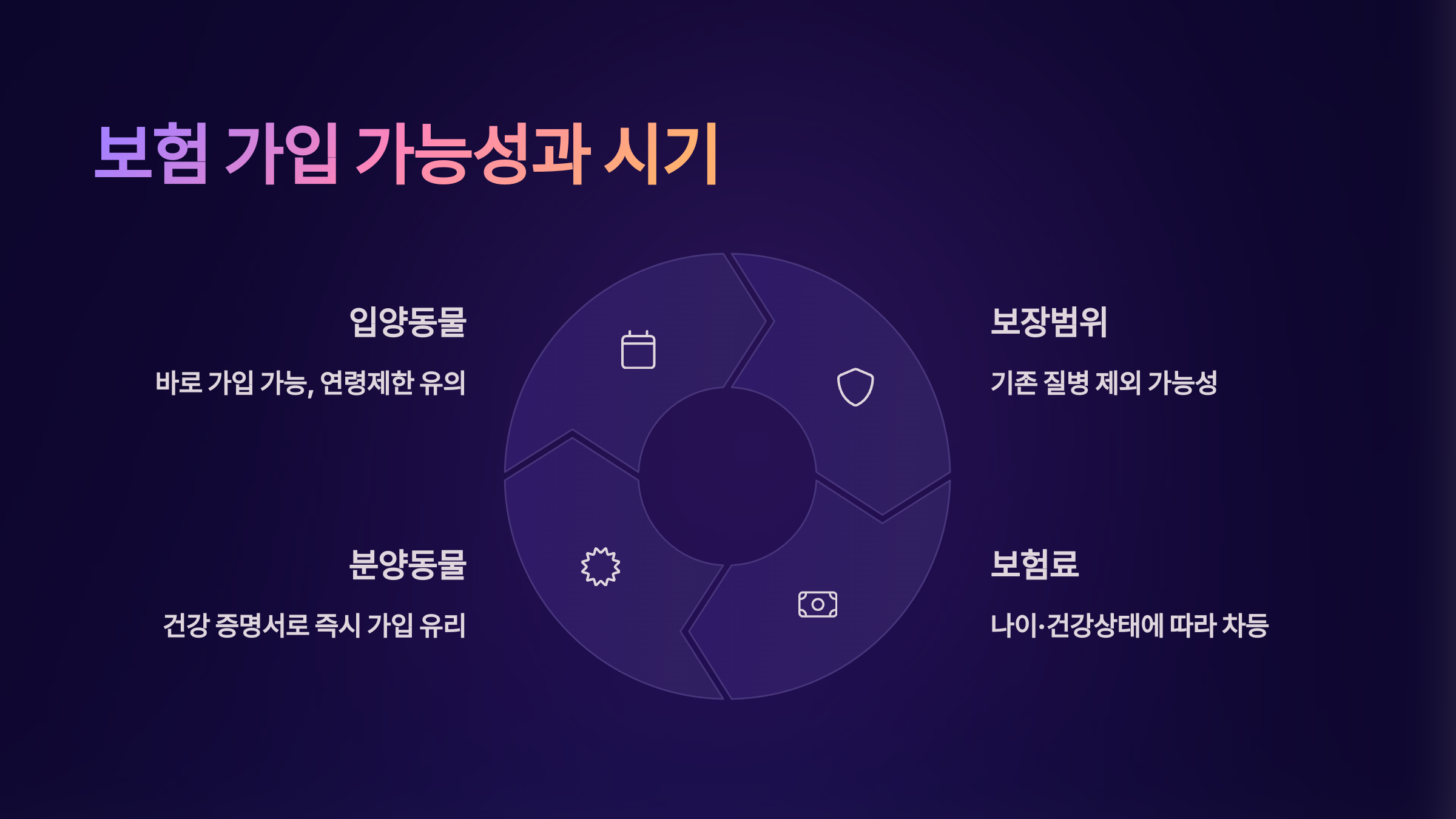 다음은 🛡️ 보험 가입 가능성과 시기를 알려드릴게요! 입양과 분양에 따라 보험 가입 조건도 다를 수 있어요 🐾
