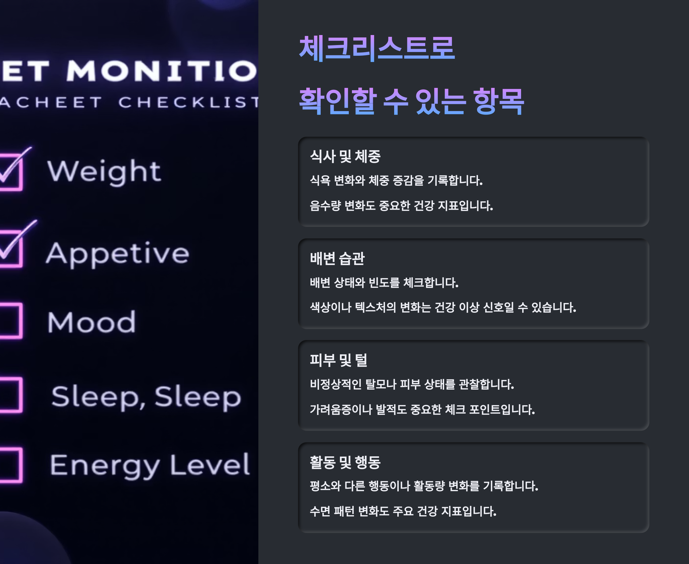 - 🩺 확인 항목 → 식사, 배변, 활동성, 눈·귀·피부, 체중까지 모두 포함