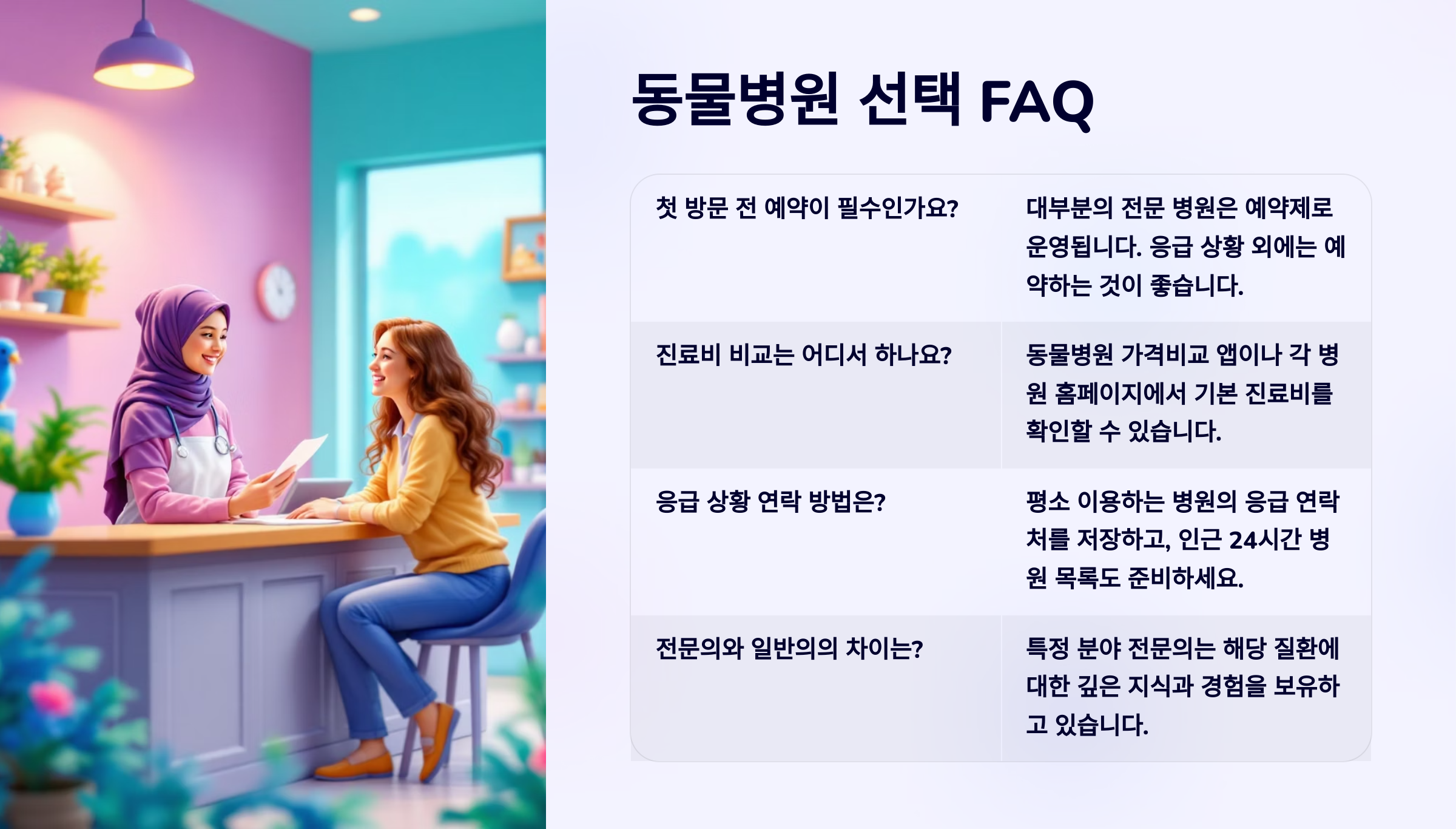 이제 다음은 동물병원 선택 관련 FAQ 8가지를 알려줄게요! 실제 보호자들이 가장 많이 물어보는 질문만 골라서 정리했어! 🙋‍♀️