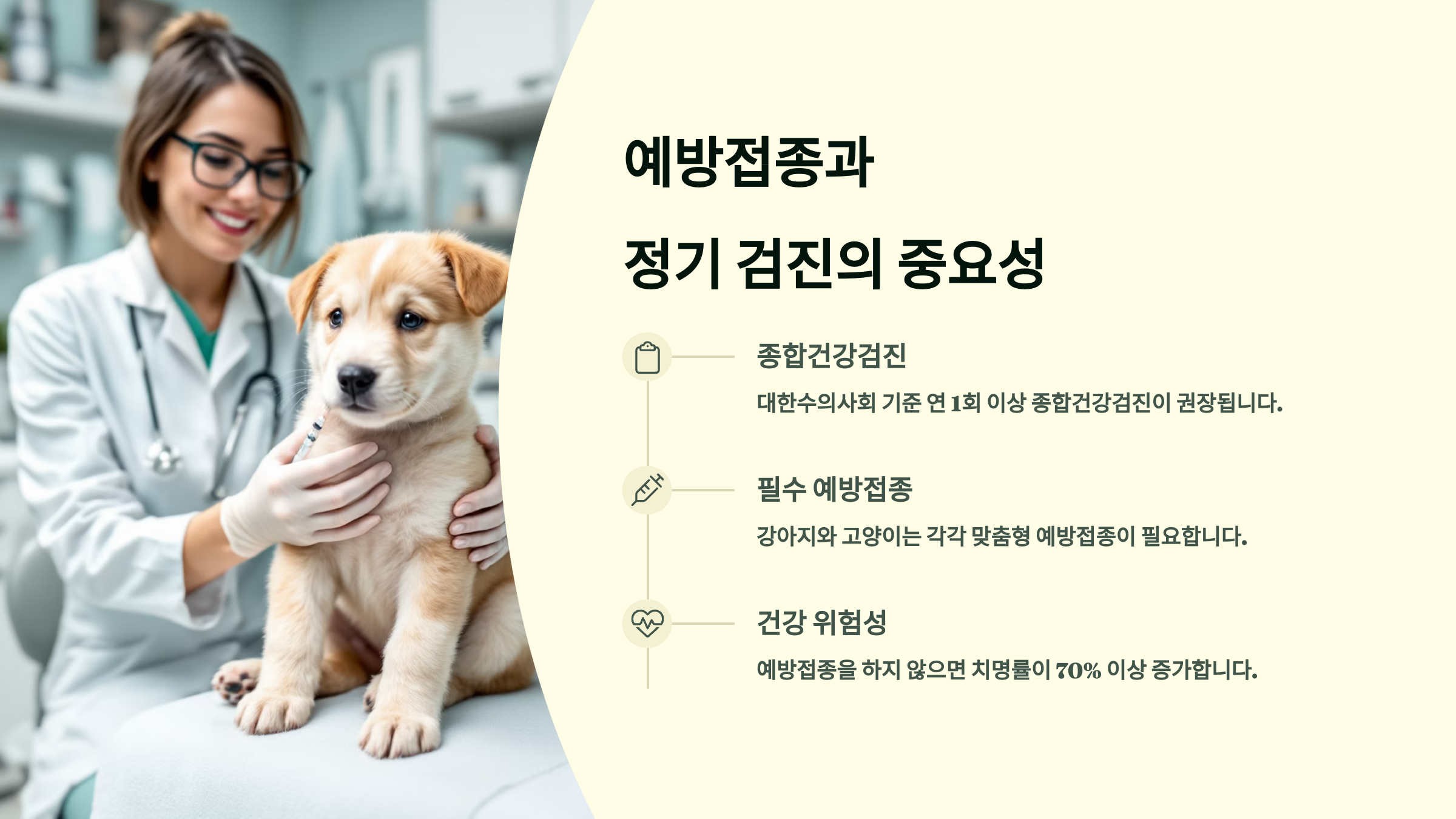 반려동물은 사람처럼 말로 증상을 설명할 수 없어요. 그래서 정기 검진과 예방접종이 훨씬 중요하답니다. 특히 강아지와 고양이의 경우, 어릴 때부터 맞아야 하는 예방백신들이 있어요! 🐕🐈