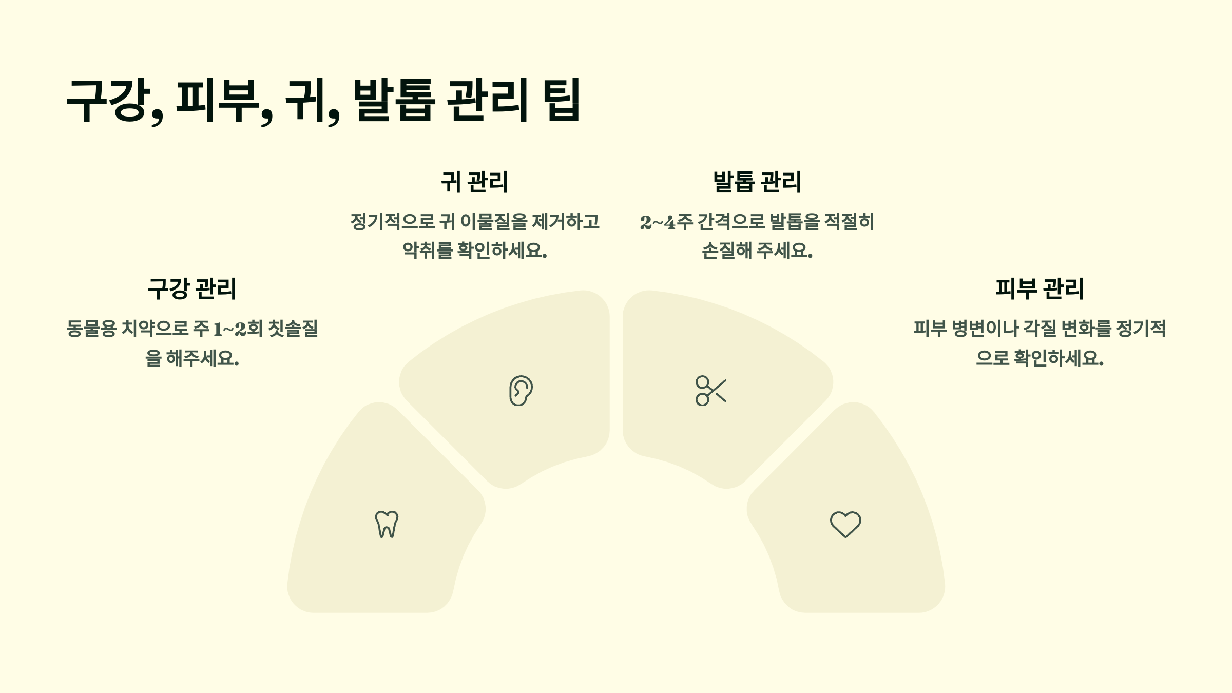 | 🦷 구강 | 전용 칫솔, 치약으로 양치 | 주 2~3회 | 사람용 제품 절대 금지 |
