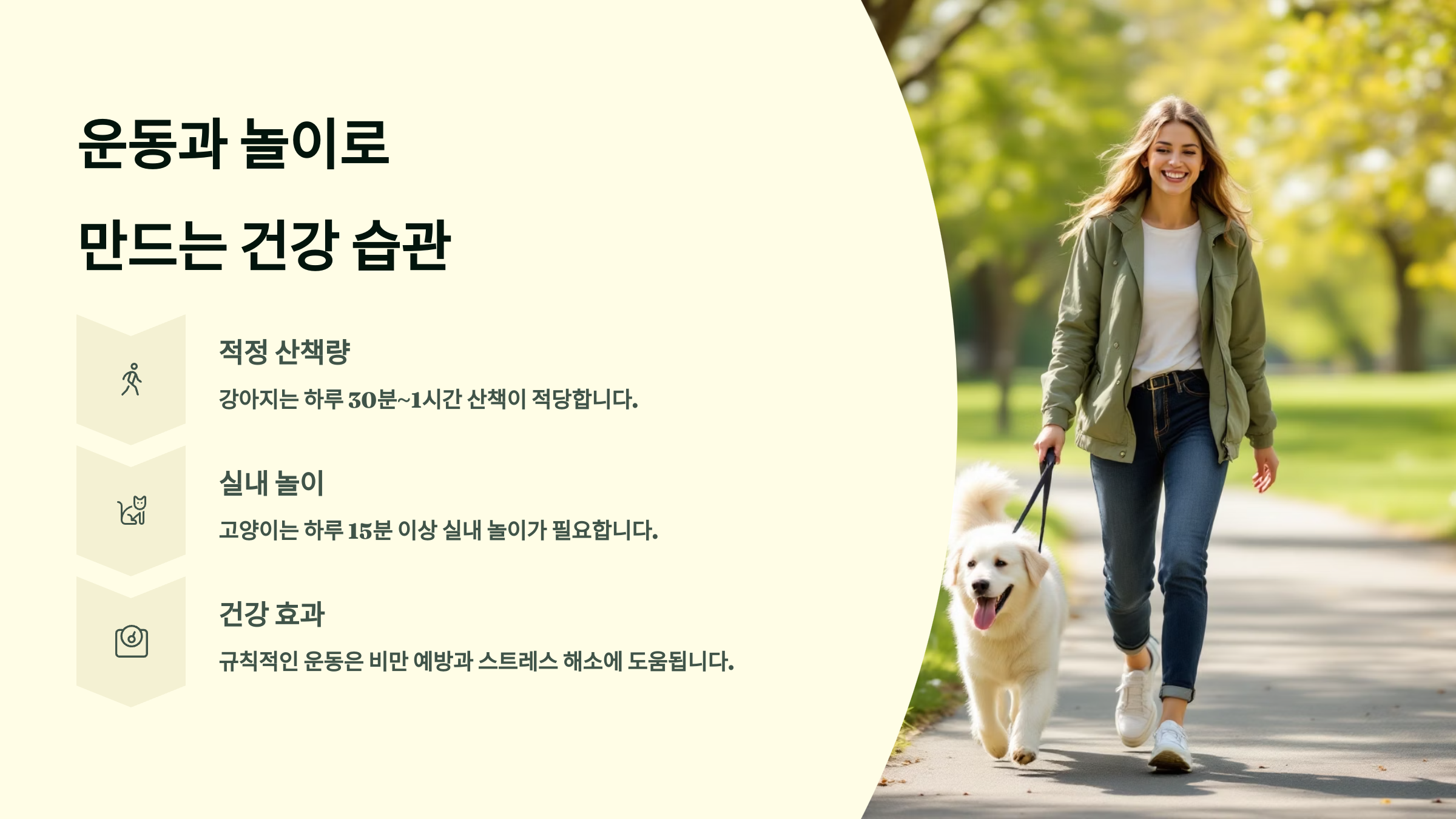 운동은 반려동물의 신체 건강은 물론, 행동문제 예방과 정서 안정에도 결정적인 역할을 해요. 하루 종일 집에만 있는 아이들에게는 산책이나 장난감 놀이가 정말 소중한 시간이에요. 🧠💪