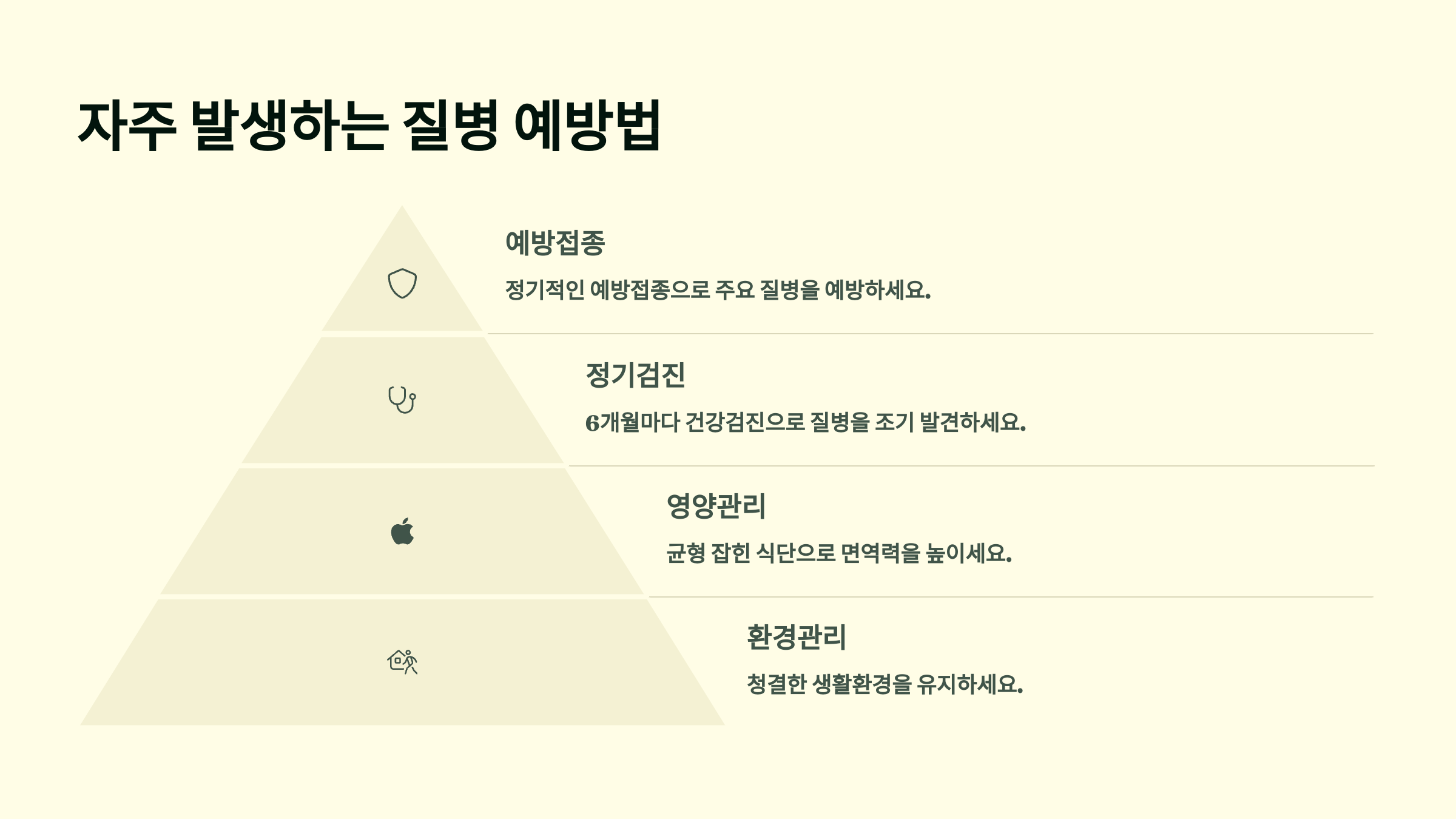 이 백신들은 전염병을 막아줄 뿐 아니라 공공장소나 병원, 미용실 이용 시 필수 조건이기도 해요. 또한 매년 1~2회 기본 검진을 받으면 조기 발견이 어려운 질병도 미리 알 수 있어요. 🔍