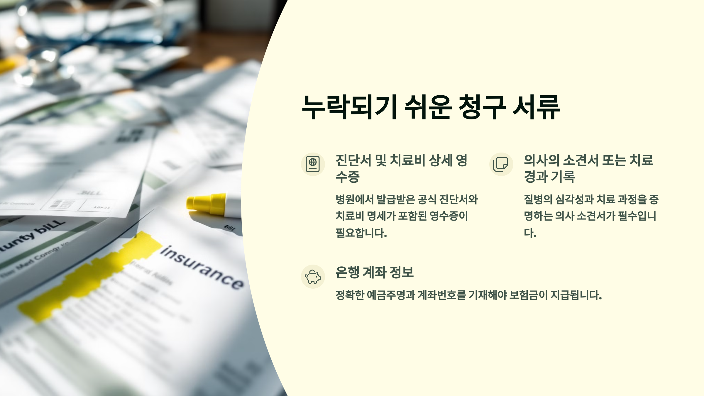⚠️ 진단서만 내고 진료비 영수증 빠지면 안 되고, 진료비만 내고 진단서 없으면 '보장대상 불분명'으로 처리돼요. 서류 3종은 항상 세트!로 제출해야 안전해요. 📎🗂️