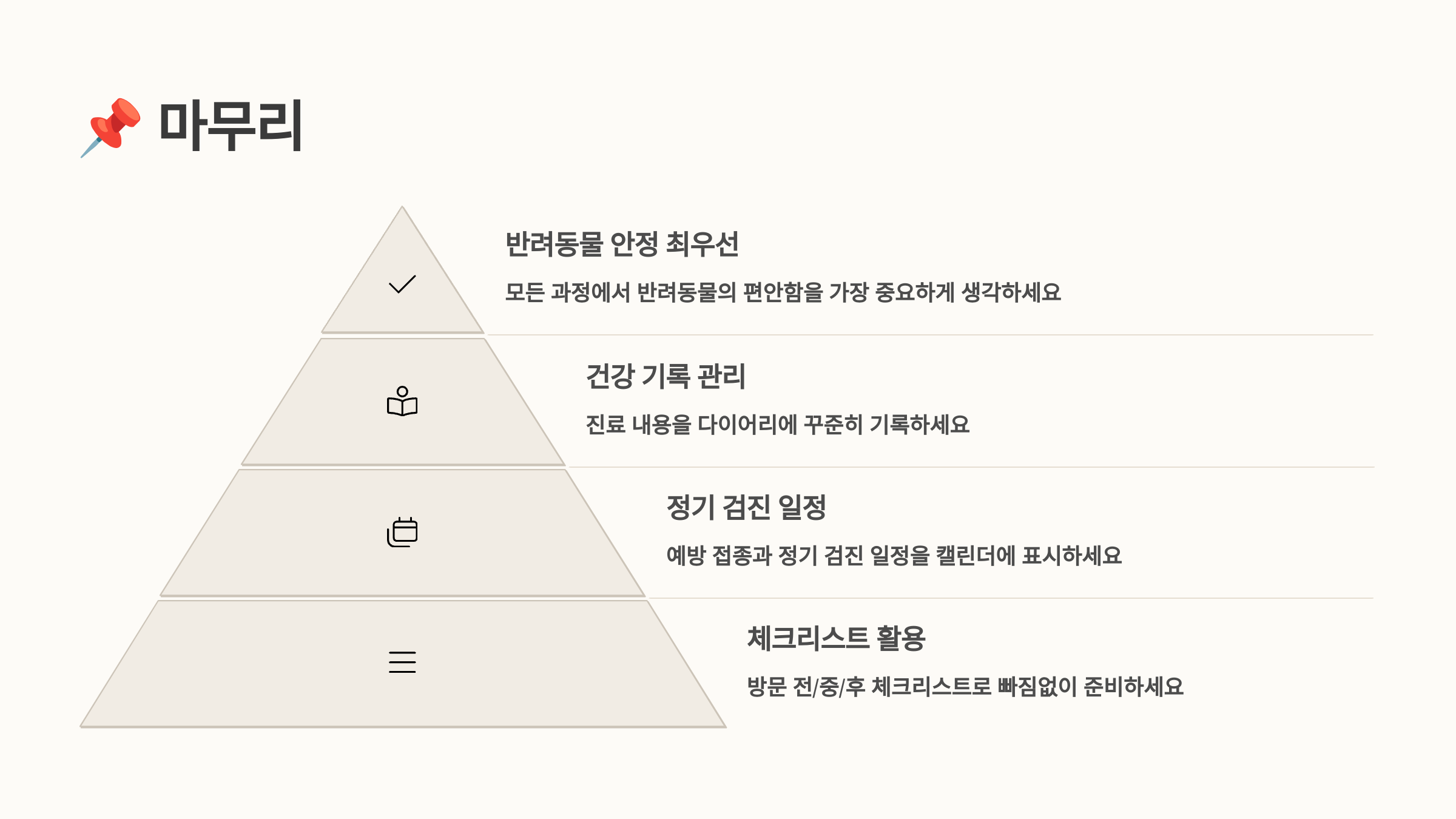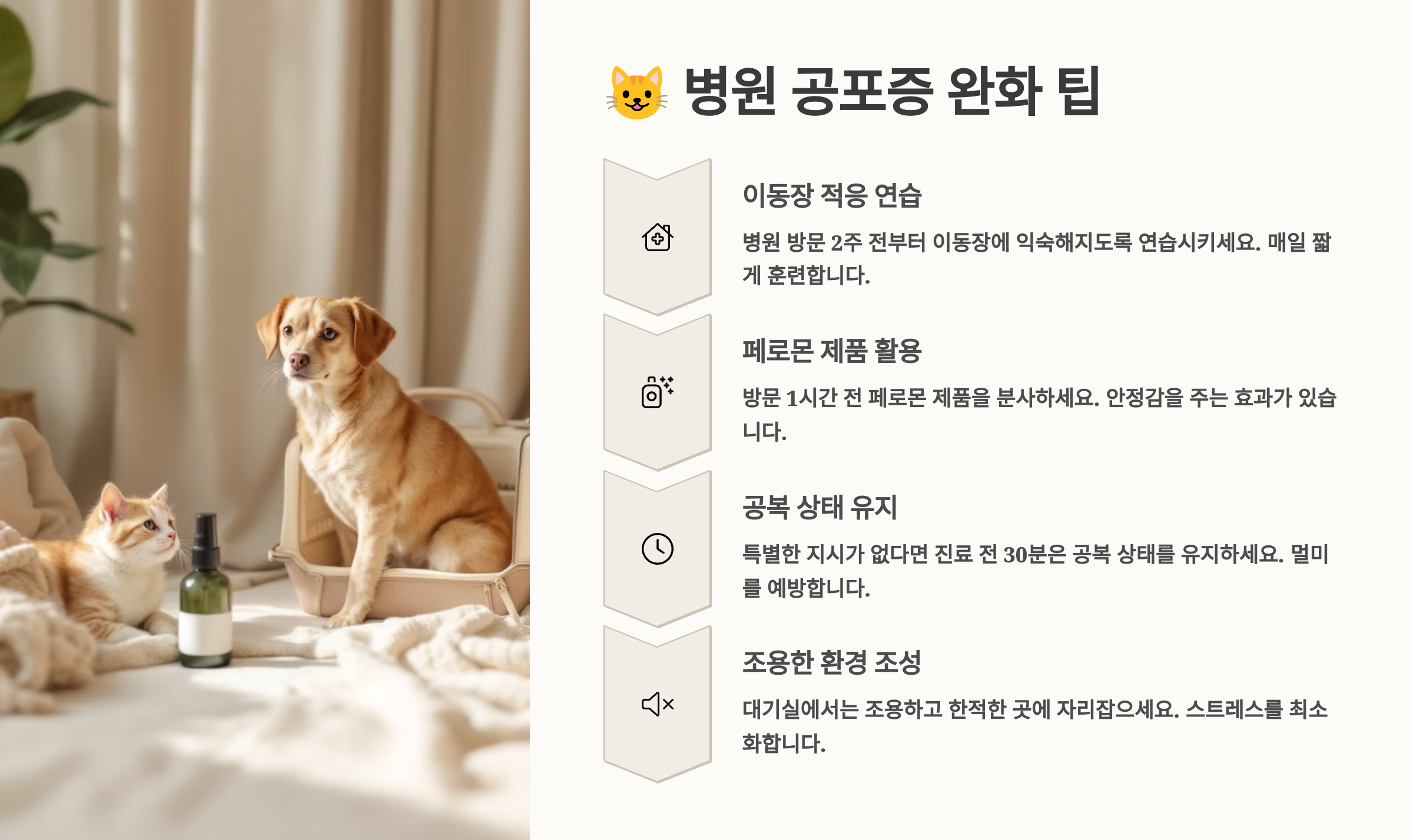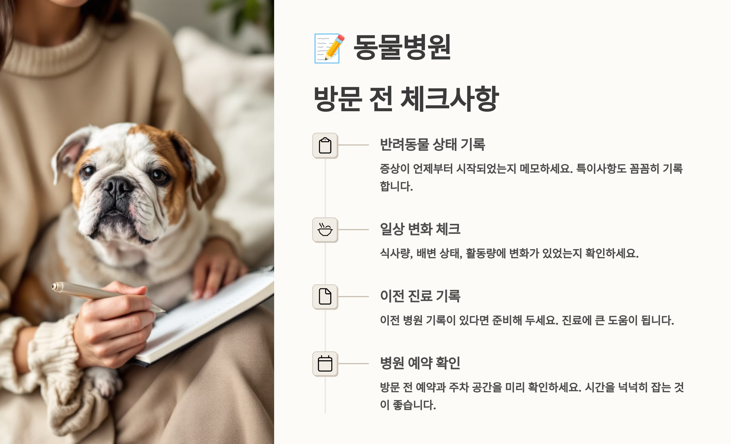 📌 준비는 반이에요! 침착한 보호자 태도는 아이에게도 전해지기 때문에, 사전 체크만 잘해도 병원 방문이 훨씬 수월해질 수 있어요. 🩺🐾