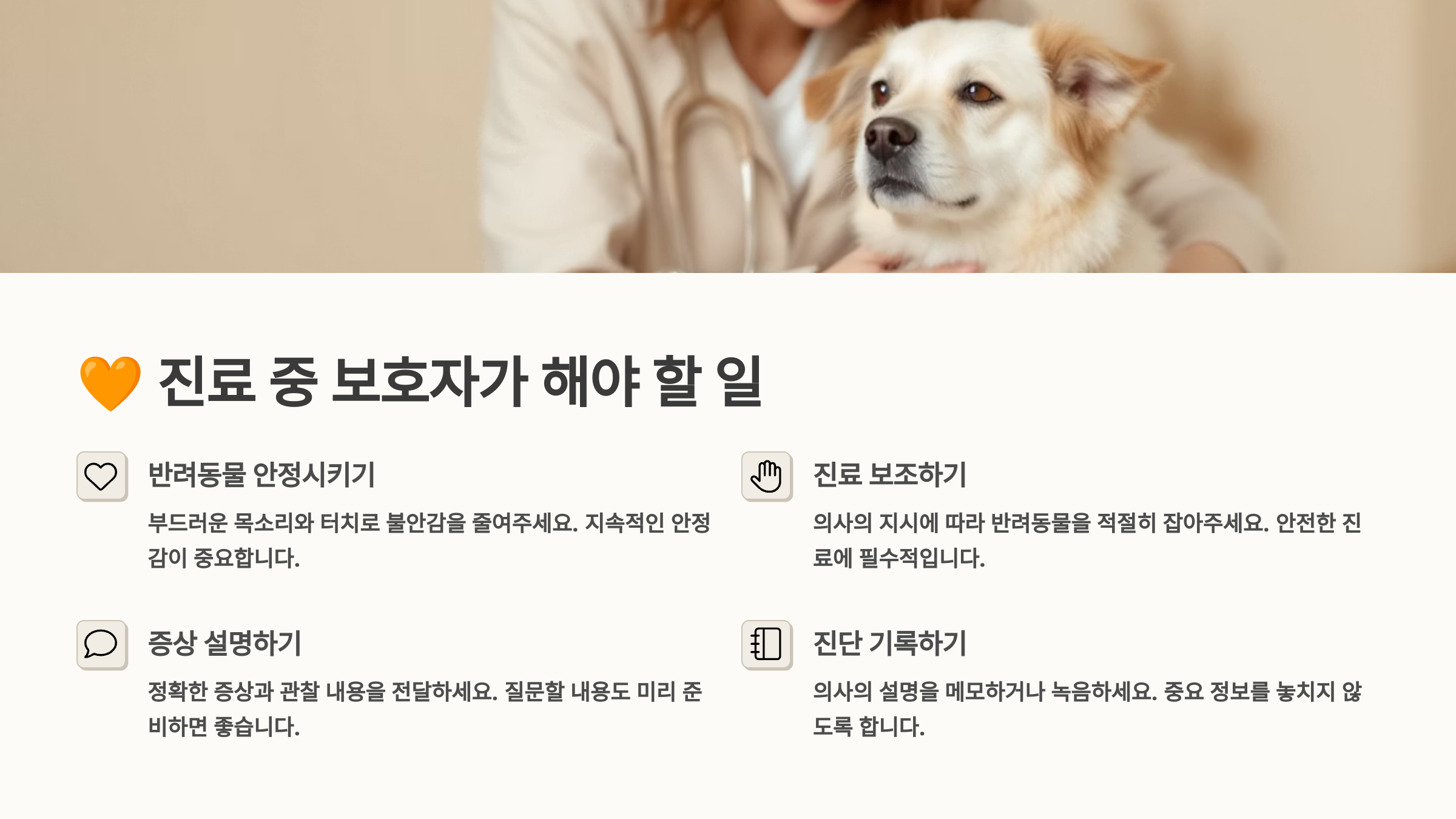 🐶 보호자의 역할은 단순히 아이를 데려가는 게 아니라, 아이의 생활, 증상, 반응 등을 대신 전달하고 관찰하며 진료 과정에 참여하는 거예요. 수의사와 협력하는 파트너의 입장이죠.
