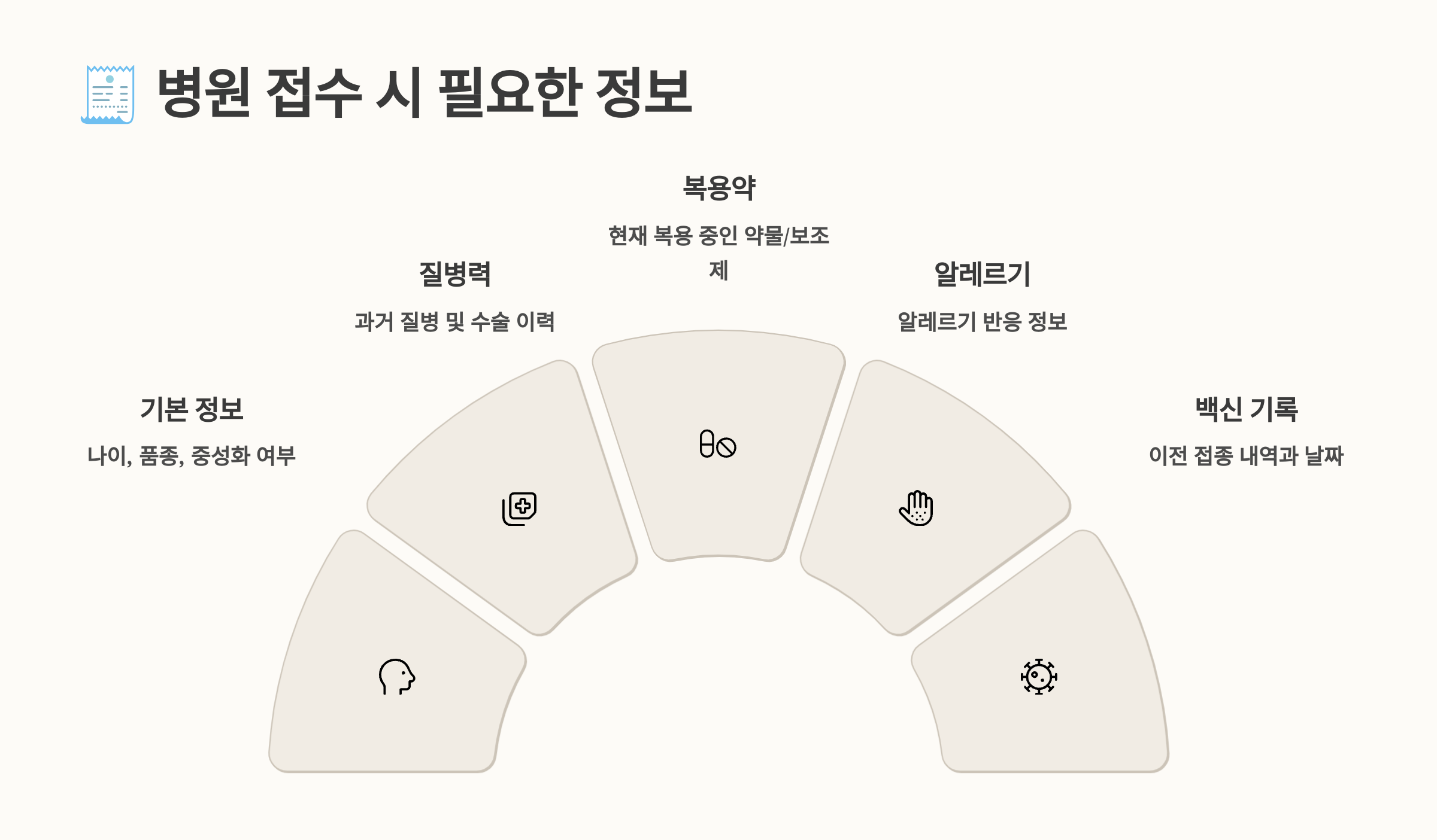 | 진료 기록지(있다면) | 예방접종 카드, 이전 병력 메모 등 |