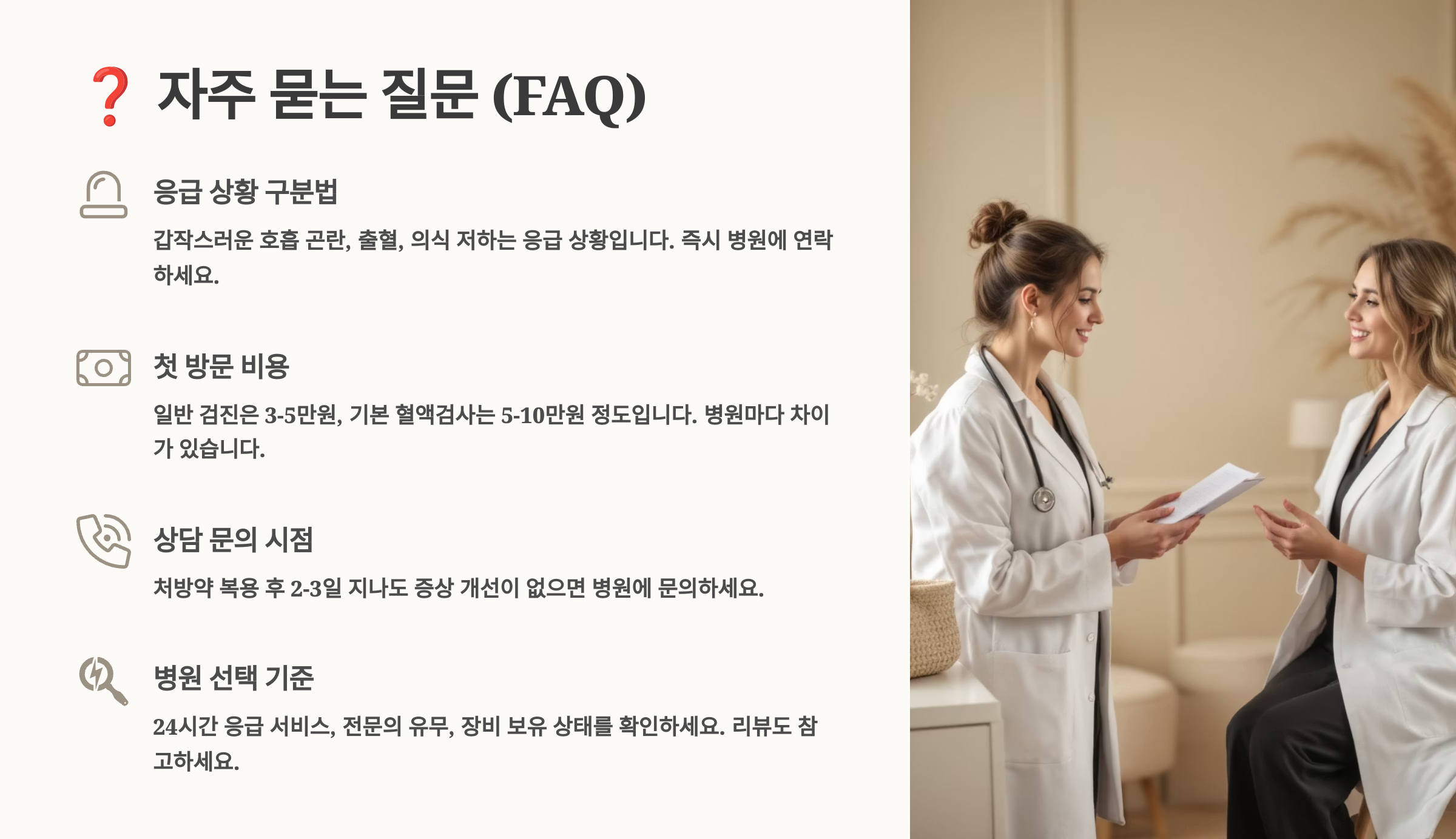 A4. 병원마다 가격이 다르지만, 기본 진찰비 + 검사/처방 비용이 따로 있어요. 전화로 대략적인 견적을 문의하면 알려주는 경우가 많아요.