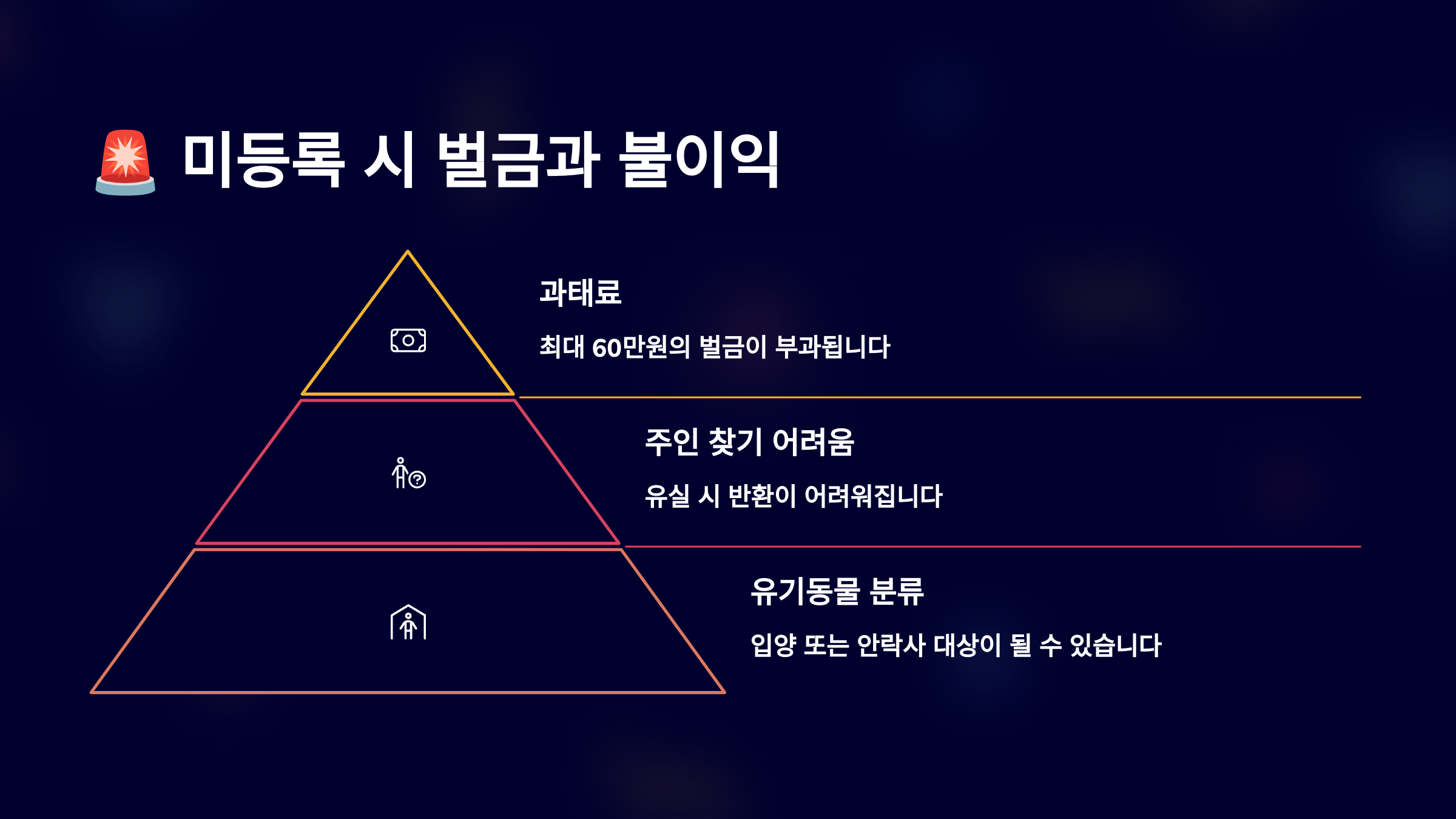 ✔ 특히 등록 후 이사, 소유자 변경, 사망 등 정보 변경 시 30일 이내에 신고하지 않으면 처벌 대상이 될 수 있어요! 이건 단순 실수가 아니라 법 위반으로 간주돼요. 🧑⚖️