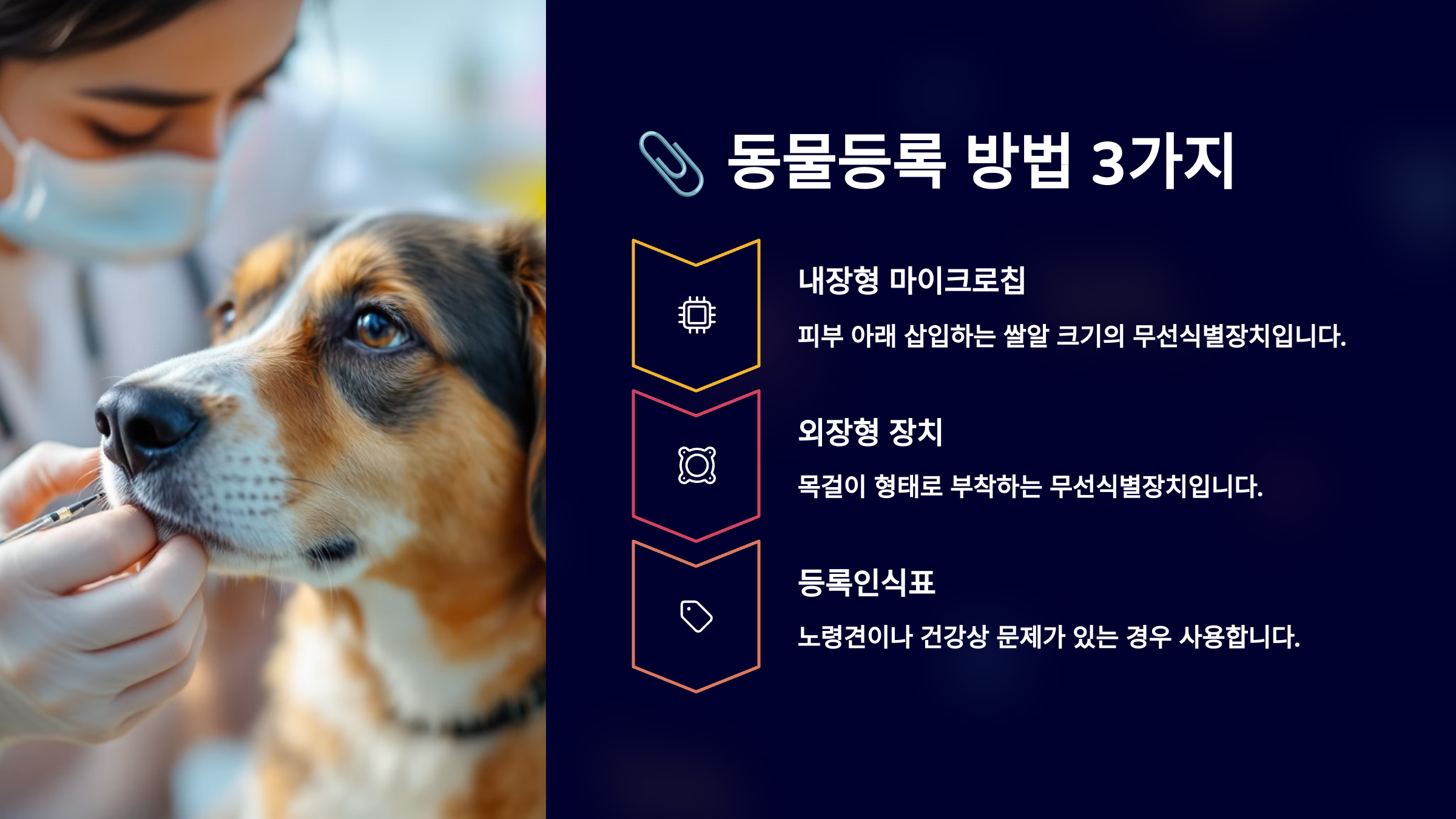 동물등록은 총 3가지 방식으로 나눠져 있어요. 방법에 따라 장착 위치, 비용, 인식률, 장단점이 달라지니까 각자의 생활 방식에 맞는 방법을 선택하는 게 좋아요! 🐕📋