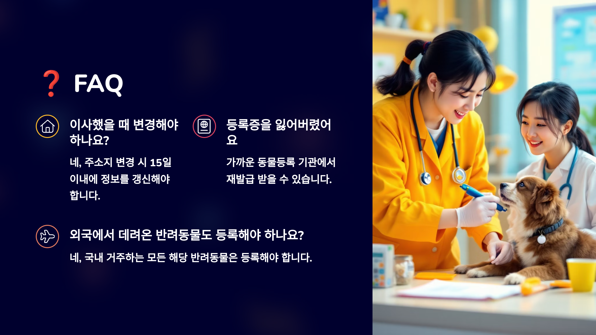 이제 보호자분들이 가장 궁금해하는 동물등록 관련 자주 묻는 질문들 FAQ로 넘어가볼게요! ❓