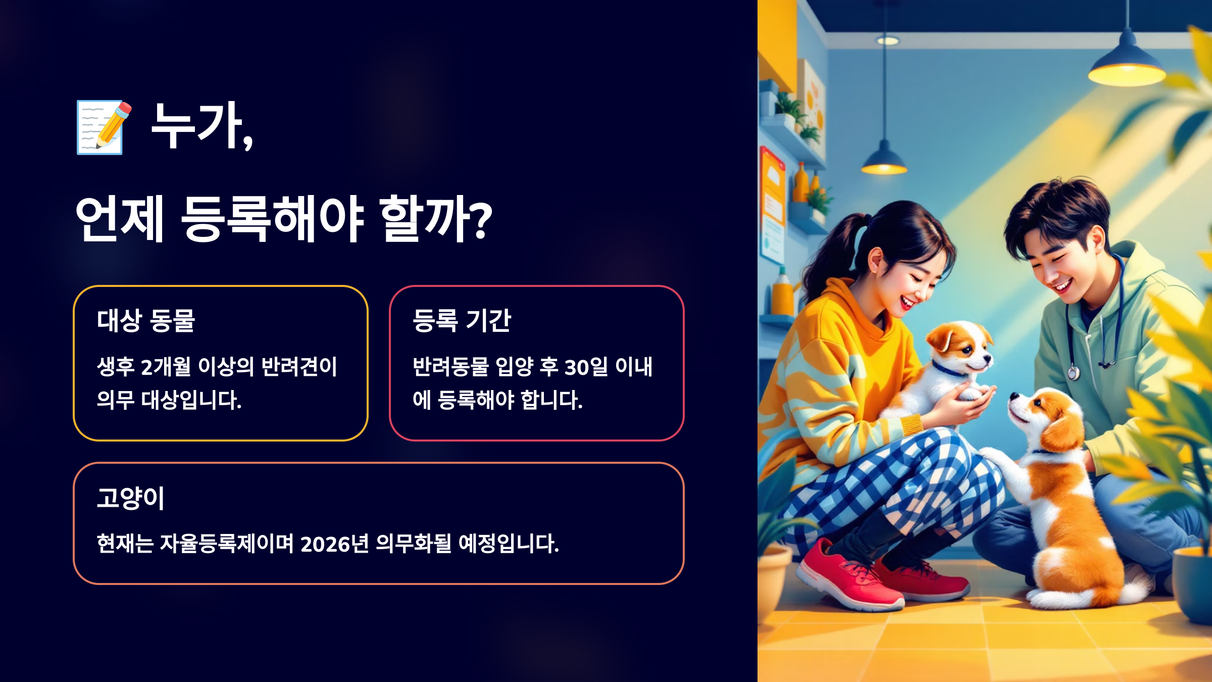📣 등록을 미루면 벌금 대상이 될 수 있어요. “언젠가 하지”는 위험한 생각! 입양한 그 달 안에 꼭 등록하는 습관을 들여야 해요! 🗓️