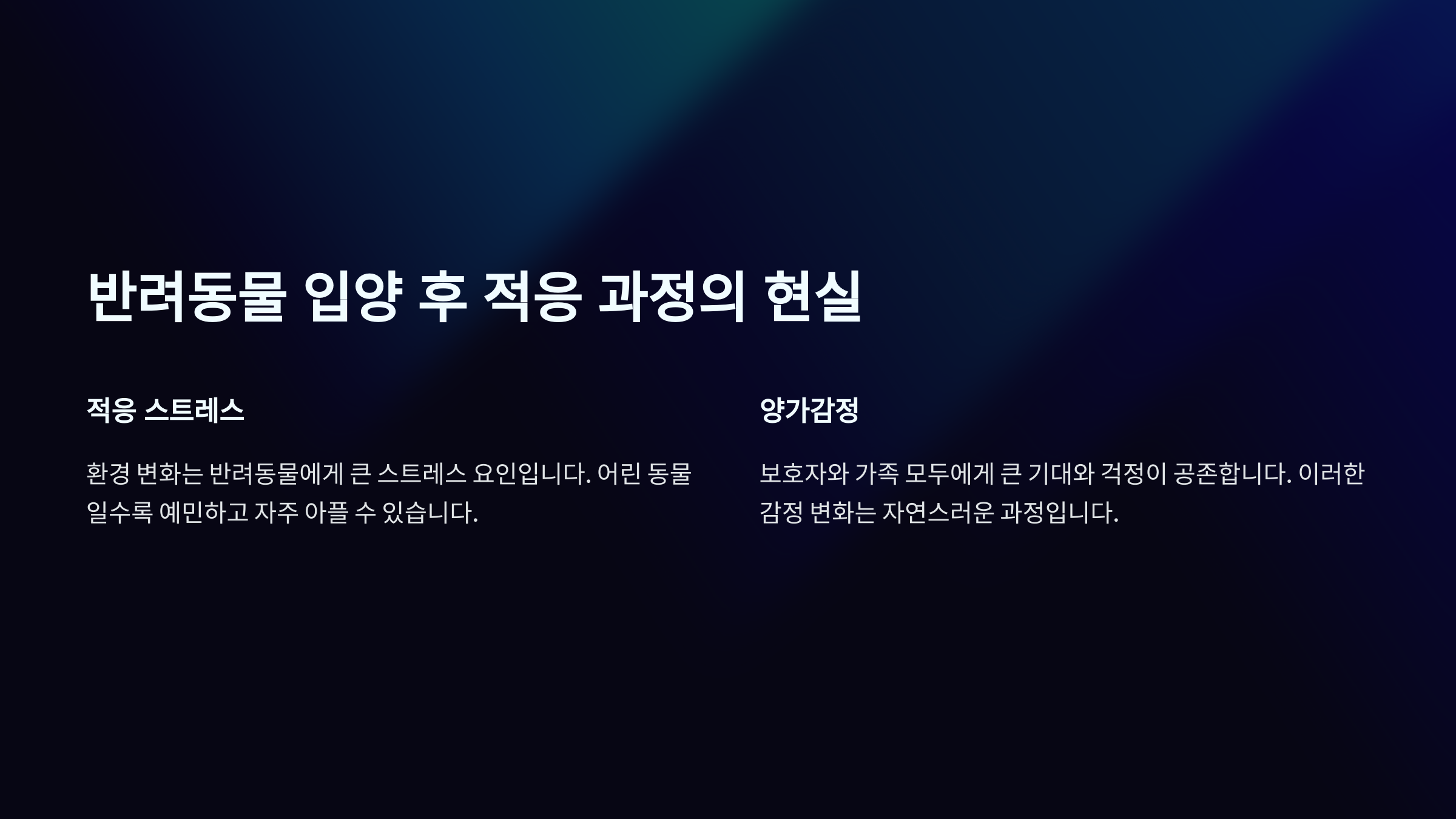 반려동물 입양 후 적응 과정은 각 가정마다, 그리고 각 동물마다 다르게 나타나지만, 대부분 3개월 정도면 안정적인 관계를 형성할 수 있어요. 중요한 것은 서두르지 않고 충분한 인내심을 갖고 기다려주는 것이에요. 반려동물도 새로운 환경과 가족에게 적응하기 위해 나름대로 최선을 다하고 있다는 것을 이해하고, 따뜻한 관심과 사랑으로 도와주시기 바라요.