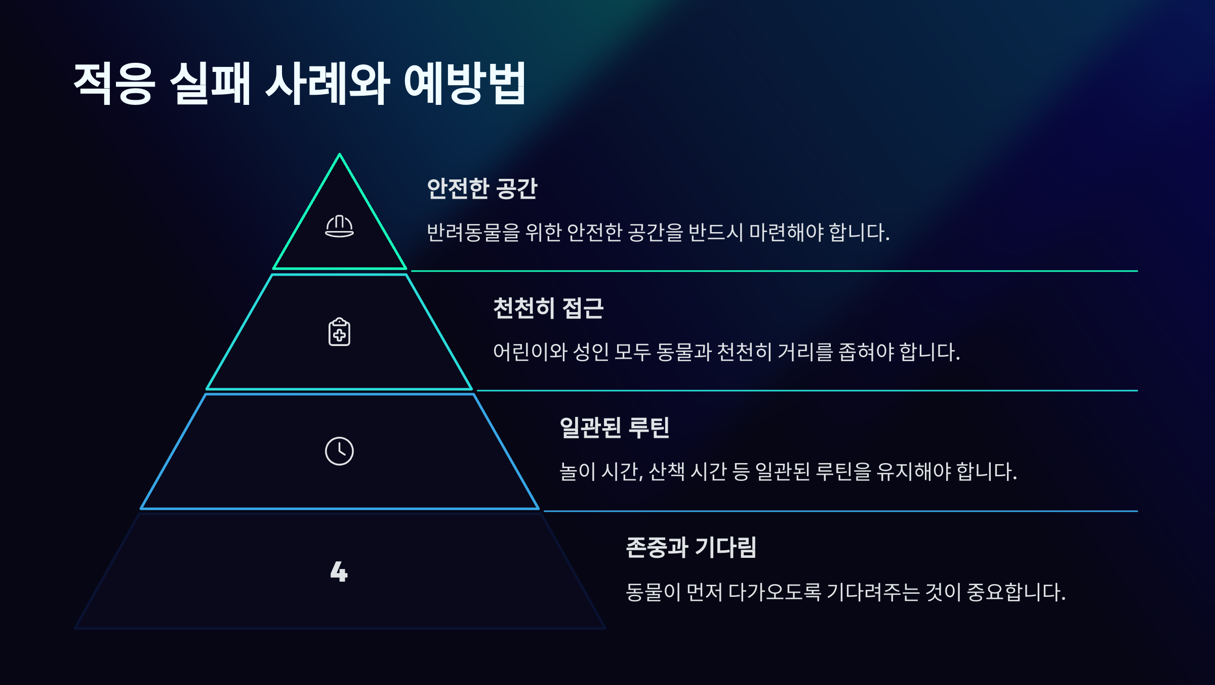 | 점진적 노출 | 단계별 확장 | 적응 속도 향상 | 너무 급하게 하지 말 것 |