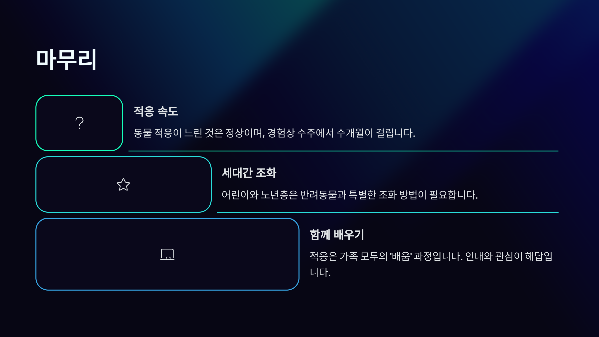 | 안정기 | 1-3개월 | 루틴 적응 | 규칙적 생활, 유대감 형성 |