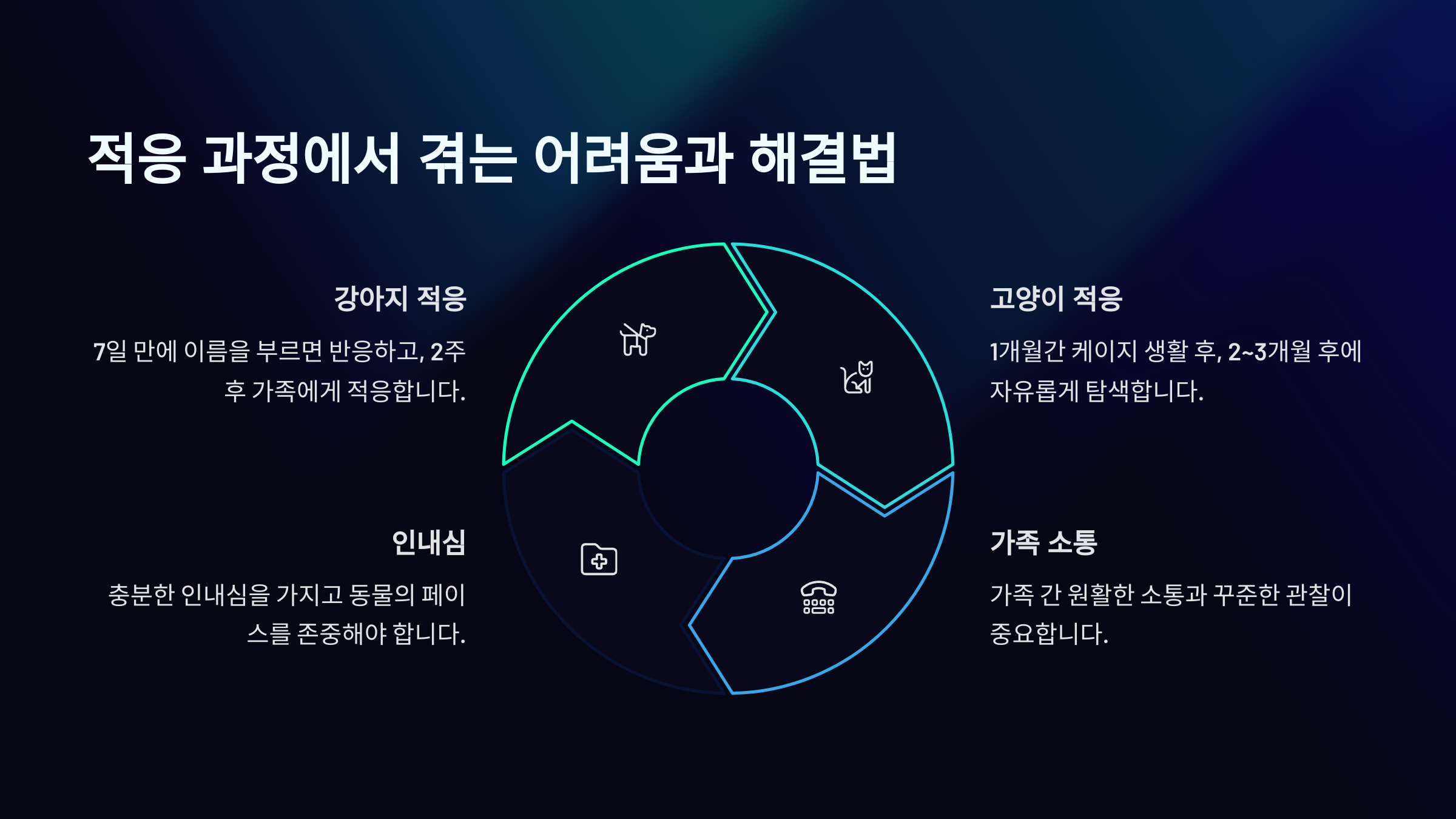 적응 과정에서 가장 중요한 것은 일관성과 인내심이에요. 반려동물이 스트레스를 받는다고 해서 계속 달래주거나 과도하게 관심을 보이면 오히려 의존성을 키울 수 있어요. 대신 일정한 루틴을 유지하면서 안정감을 주고, 반려동물이 스스로 적응할 수 있는 시간과 공간을 제공하는 것이 중요하답니다. 🏠