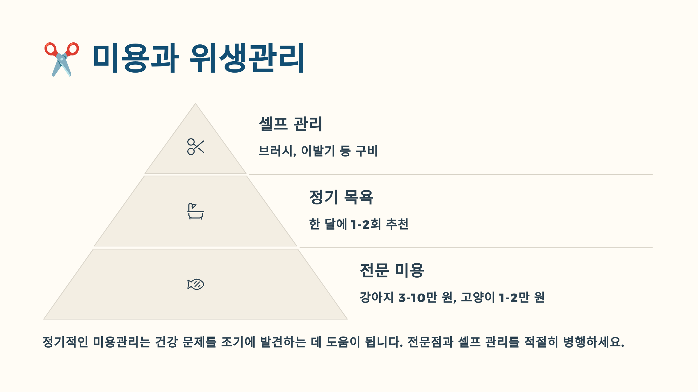 이제 다음은 반려동물의 외모와 위생을 책임지는 ✂️ 미용과 위생관리에 대해 살펴볼 차례예요!