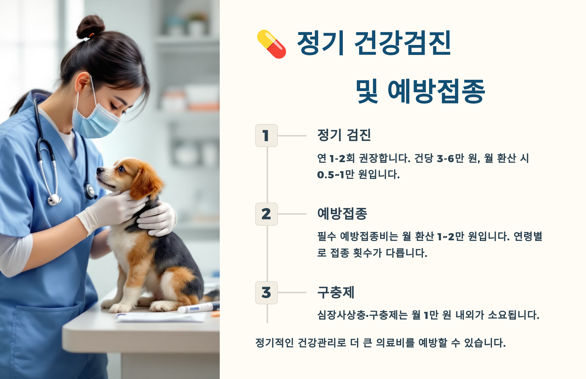 예방접종은 생애 주기별로 다르게 들어가요. 특히 강아지는 종합백신(DHPPL), 광견병, 코로나, 켄넬코프 등이 있고, 고양이는 3종 혼합백신, 백혈병 백신, 광견병 접종이 필요하죠. 1년마다 정기적으로 맞아야 하고 접종당 2만~5만 원 선이에요. 월 평균으로 보면 대략 5천 원에서 1만 원이 추가돼요.