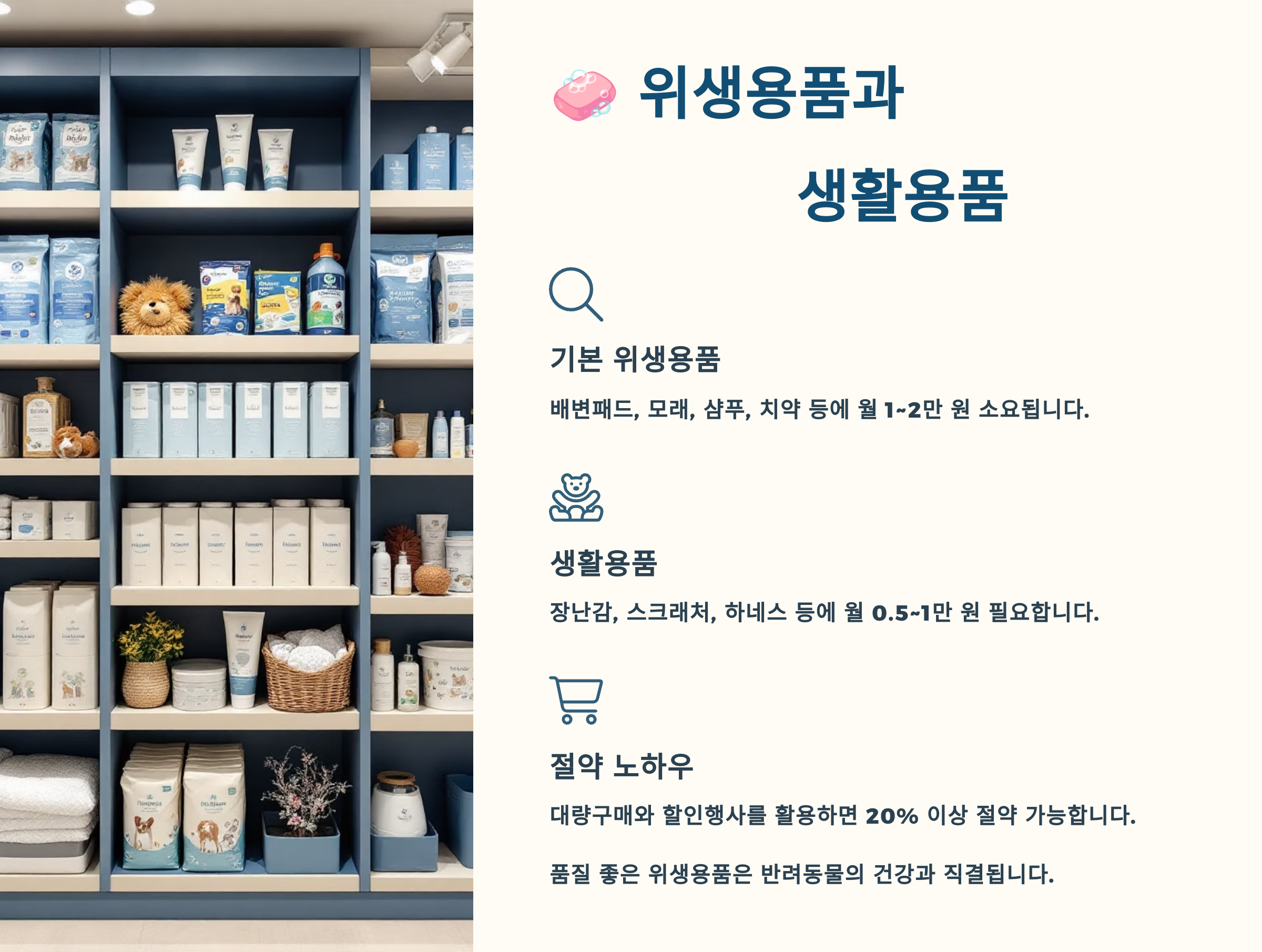 반려동물과 함께 생활하다 보면 위생과 청결 유지는 아주 중요해요. 매일 사용하는 용품은 생각보다 다양하고, 소모되는 것도 많기 때문에 월 유지비에서 결코 빼놓을 수 없는 항목이에요. 강아지는 배변패드, 고양이는 모래와 스크래처 같은 소모품이 매달 필요한 기본 생활비에 포함돼요.