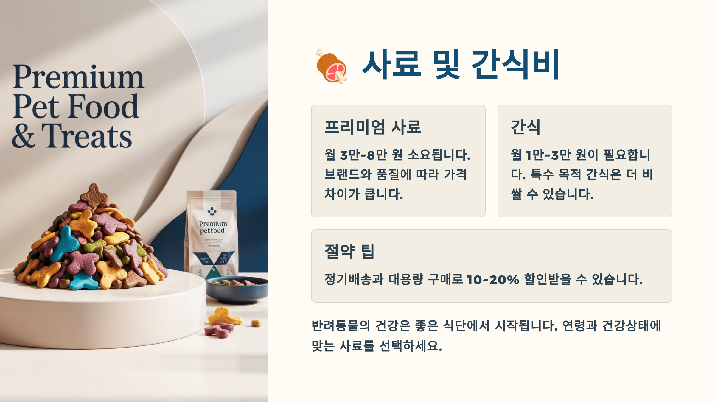 결론적으로 사료와 간식은 한 달 평균 4만 원에서 8만 원 정도 예상하면 무난해요. 물론 고급 제품이나 기능성 제품 위주로 구성하면 10만 원 이상도 드는 경우가 있어요. 그래서 가계 계획을 세울 때는 평소 급여량과 브랜드 선택에 따라 조정하는 게 중요하답니다.