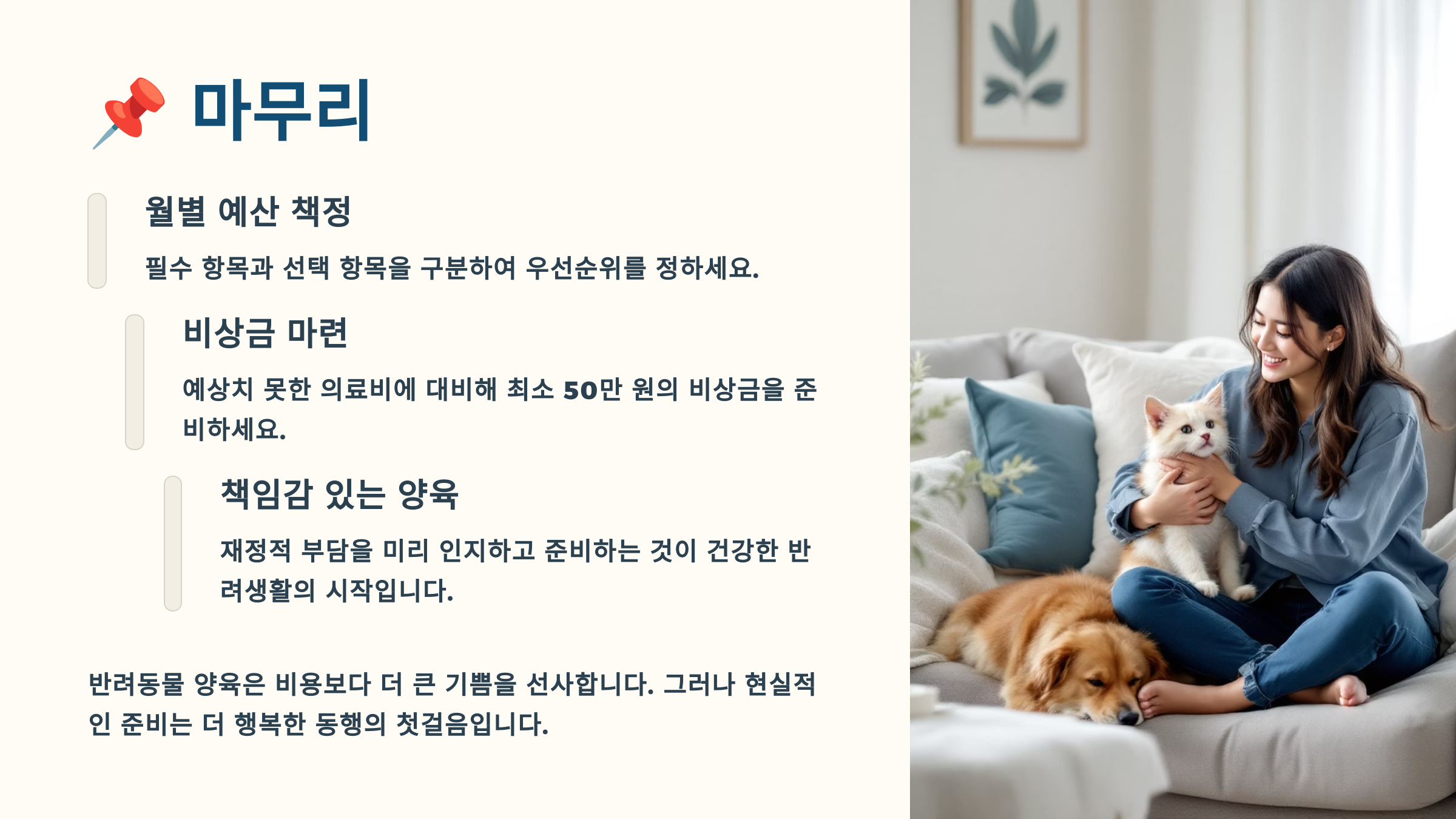 이제 강아지나 고양이를 입양하거나 이미 함께하고 있는 보호자분들께서 한 달 유지비에 대한 계획을 더 구체적으로 세울 수 있게 되었기를 바라요. 오늘 알려드린 내용을 바탕으로 각 가정에 맞는 예산과 준비가 잘 이뤄졌으면 해요!