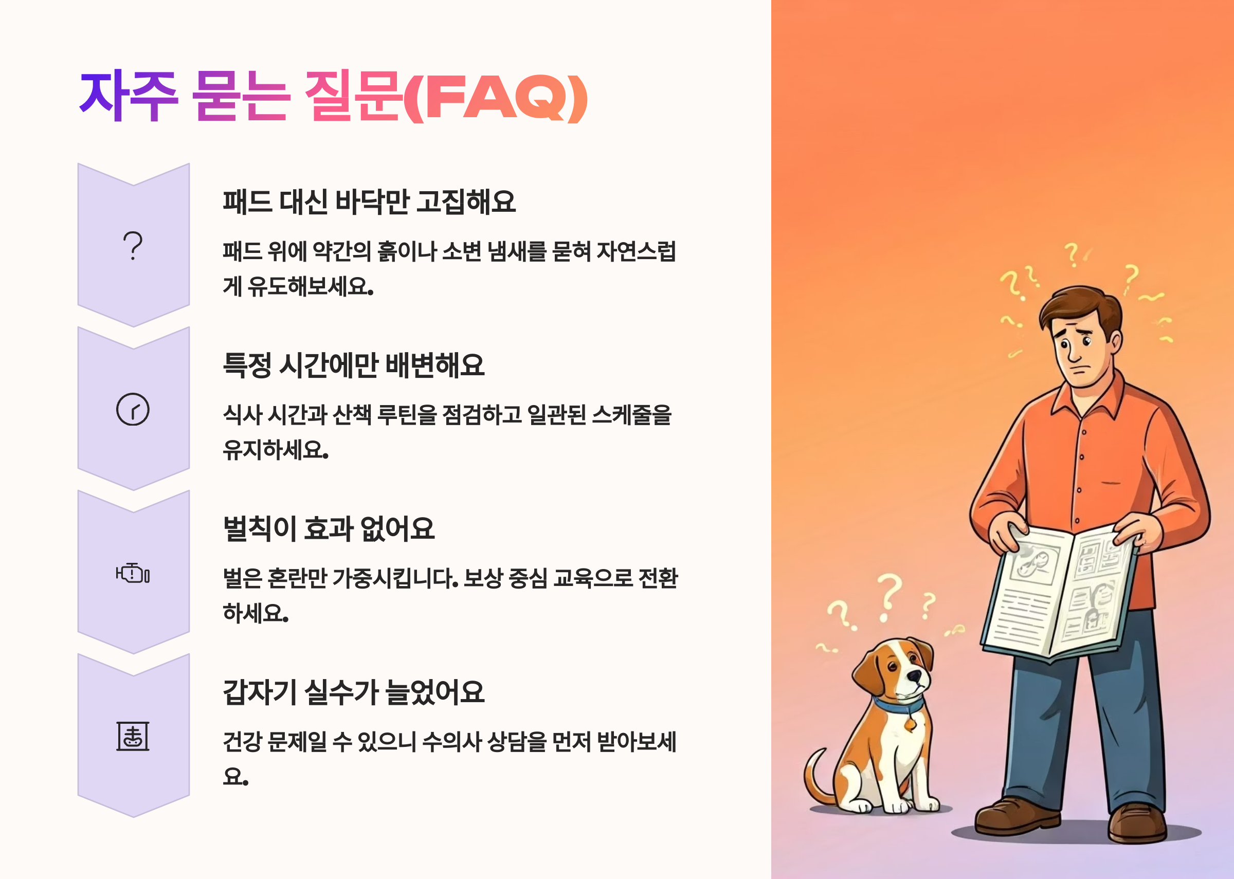 “어디서 싸야 하는지 몰라요…”라는 신호일 수 있어요. 그럴 땐 하루 2~3번 정도 배변판에 데려가 3분 정도 기다리게 하는 훈련을 추가하면 좋아요 ⏳