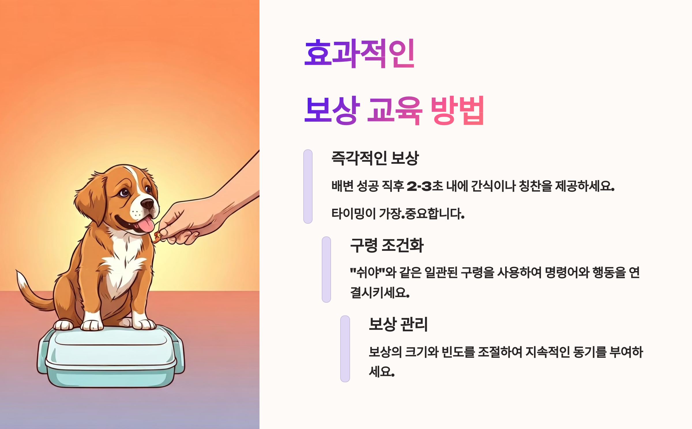 배변 훈련에서 가장 강력한 도구는 바로 보상이에요. “이 행동을 하면 좋은 일이 생긴다!”는 긍정적인 학습을 통해 반려동물은 올바른 배변 습관을 익히게 돼요 🐶