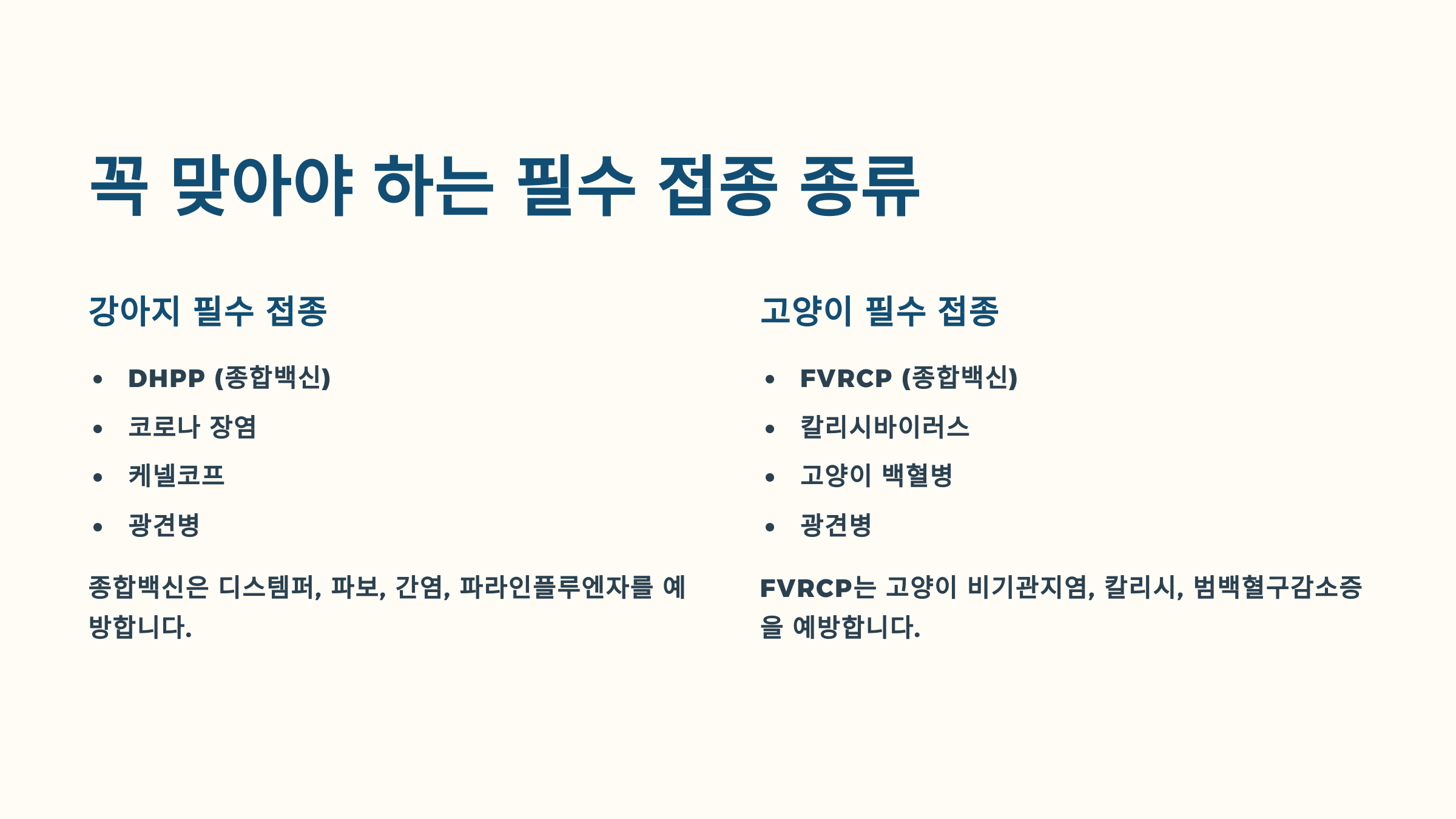 | 기본 접종 백신 | DHPP, 광견병 | FVRCP, 광견병 |